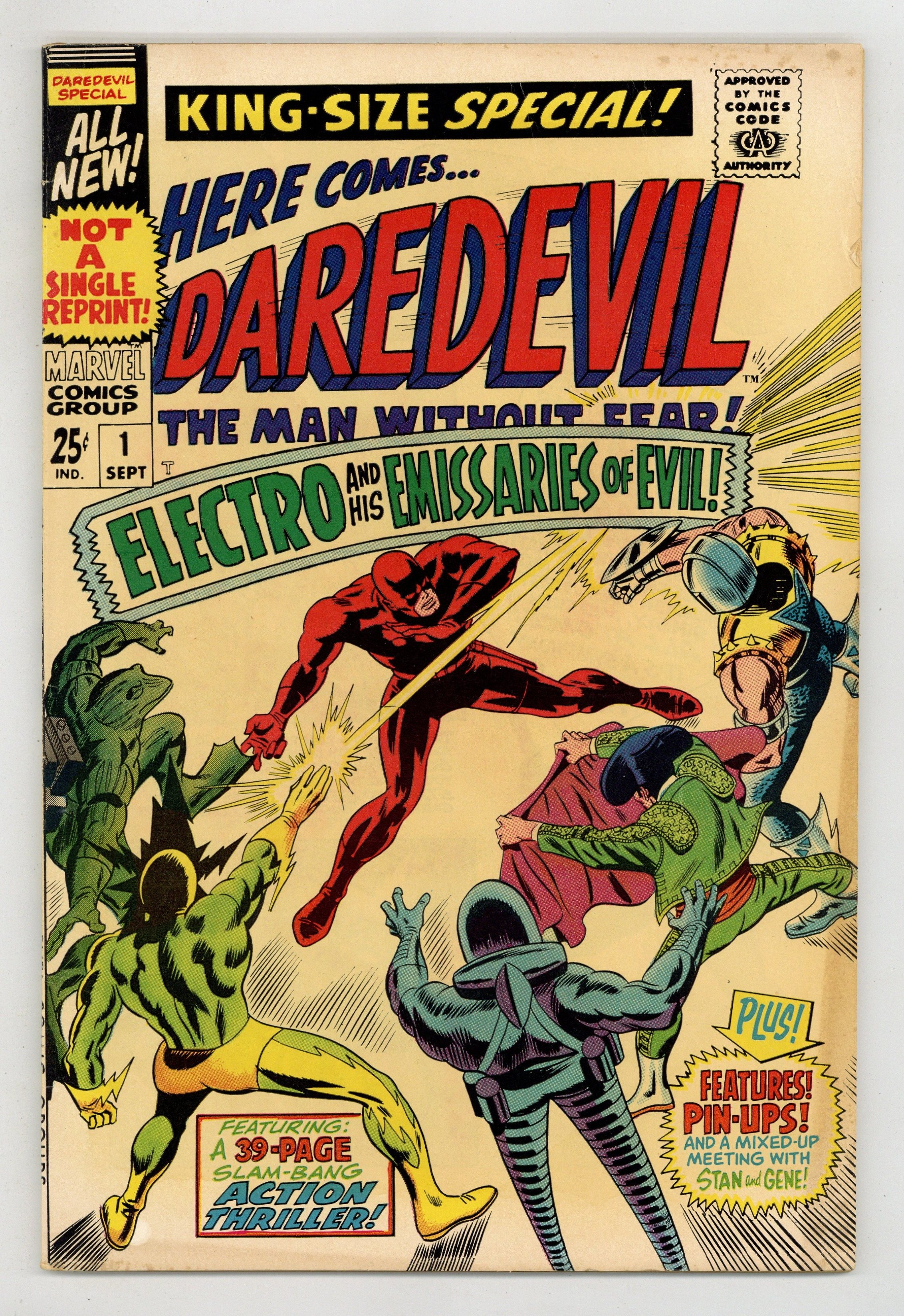 Ended May 14 2025 Winning Bid $24 64-page all-new giant-size issue (no reprints). "Electro and the Emmisaries of Evil!" Script by Stan Lee, pencils by Gene Colan, inks by John Tartaglione. Back-up features inclue "Inside Daredevil" (2 pages of "far-out facts"), "An Explanation" (two pages about Mike Murdock), "Blueprint for an All-Purpose Billy Club" (one page), "At the Stroke of Midnight" (three pages showing Lee and Colan in a story conference), and pin-ups of Karen Page, Foggy Nelson, Ka-Zar, Daredevil, the Gladiator, the Leap-Frog, the Owl, and the Masked Marauder.. Colan/Frank Giacoia cover. Cover price $0.25. Grade: VG/FN 5.0 explanation of grade Condition: Used (collectible)