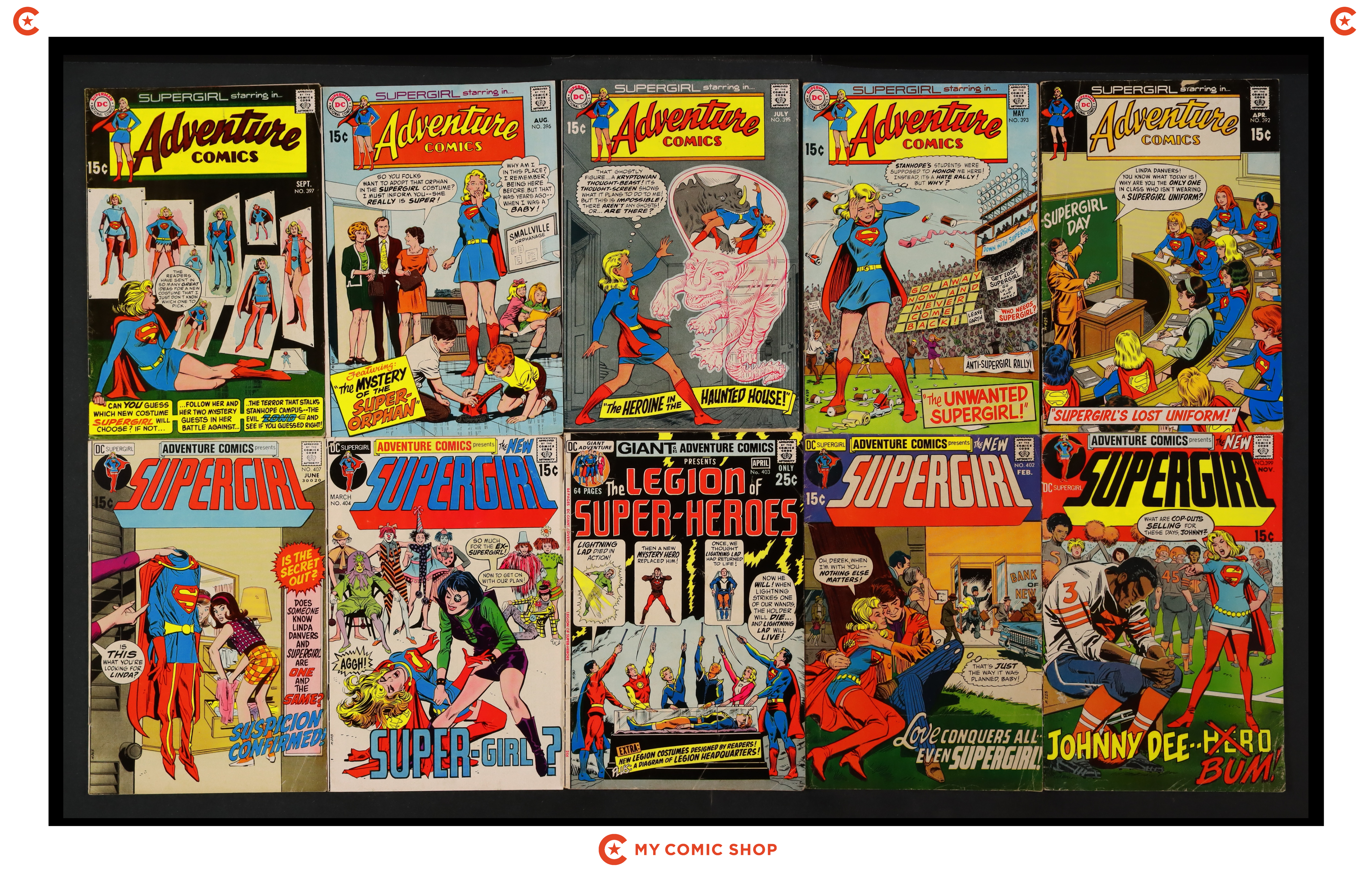 Issues 392, 393, 395-397, 399, 402-404, 407, 409, 416, 419, 424, 425, 433 of Adventure Comics (1938 1st Series). Most will grade in the GD to VG range, with 403 grading at PR (back cover missing).