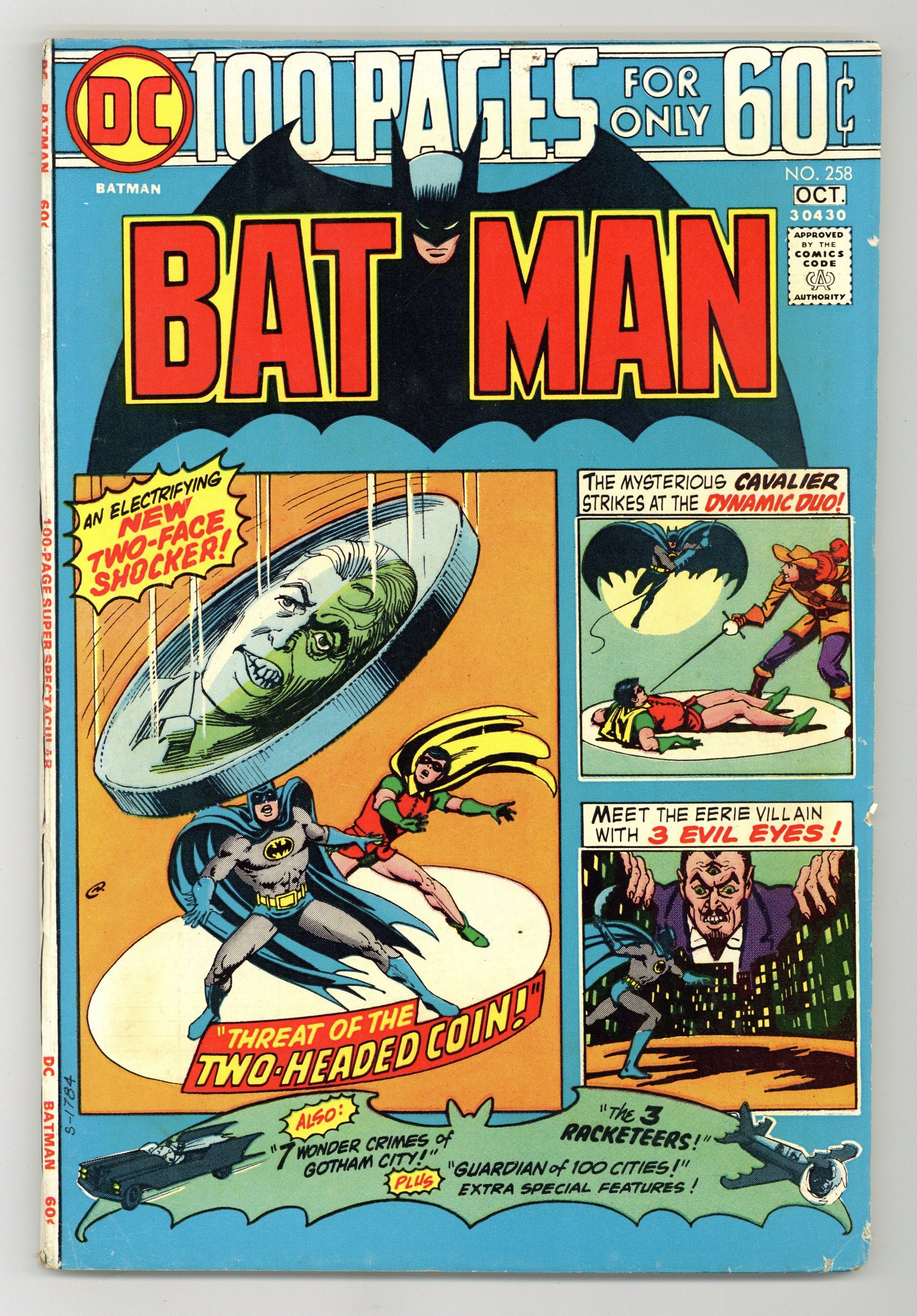 100-page giant. Cover by Nick Cardy. Two-Face is back in a new story, "Threat of the Two-Headed Coin!", script by Denny O'Neil, pencils by Irv Novick, inks by Dick Giordano; Two-Face returns, having devised a plan to extort $2 billion from the citizens of the U.S.; If the government refuses to pay, the criminal plans to destroy the government...forever! Bat-Puzzle activity page by Bob Rozakis, pencils by Carmine Infantino, inks by Murphy Anderson. "The Three Racketeers!", script by Bill Finger, pencils by Bob Kane, inks by Jerry Robinson and George Roussos; Three former racketeers sit about a table playing cards in prison discussing how the Batman and Robin brought their dreams of easy wealth to a disastrous end. "7 Wonder Crimes of Gotham City!", script by Gardner F. Fox, pencils by Sheldon Moldoff (as Bob Kane), inks by Joe Giella; The Dynamic Duo face an opponent out to commit the "Seven Wonder Crimes of Gotham City." "Twenty-Ton Robbery!", script by Don Cameron, art by Dick Sprang (as Bob Kane); The Cavalier returns in disguise to acquire a new mob that he plans to use to rob the city blind, but the theft of a whale undoes his plans. "The Guardian of 100 Cities!" script by Bill Finger, pencils by Sheldon Moldoff, inks by Charles Paris; Famed replica artifacts from various movie sets, located in a field not far from Hollywood, serve as the stage as a hideout for escaped convict Shag Darnell and his thugs. "The Man with a Thousand Eyes!", script by Bill Finger, pencils by Bob Kane, inks by Charles Paris; Count Florian, a criminal Batman and Robin once battled in London, comes to America and successfully steals a civilian invention in order to spy on America. 100 Pages, Full Color. Cover price $0.60. Grade: VG+ 4.5 explanation of grade Condition: Used (collectible)