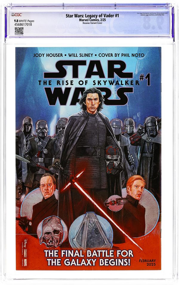 Ended Jun 10 2025 Winning Bid $30 Written by Charles Soule. Art by Luke Ross. Cover by Ramon Rosanas. DARTH VADER'S SHADOW EXTENDS INTO...THE RISE OF THE FIRST ORDER! The reign of SUPREME LEADER KYLO REN begins! Kylo's dark obsession leads him to MUSTAFAR! What secrets does FORTRESS VADER hold for the young tyrant? And what face from the past will guide him on his quest? 32 pages, full color. Rated T Cover price $4.99. Grade: CGC 9.8 explanation of grade Condition: Used (collectible) unless item is a new release