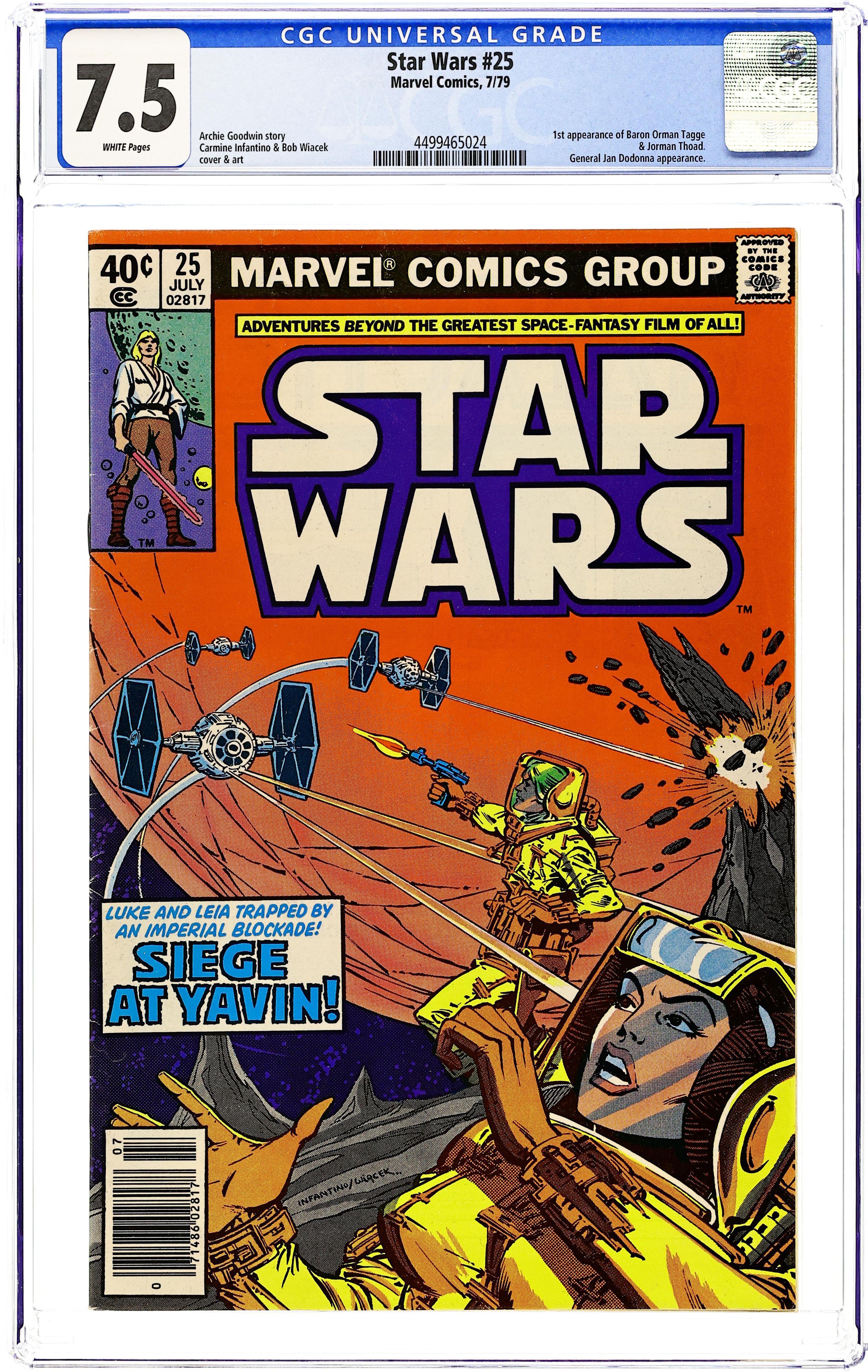 Ended Jul 28 2025 Bid History 11 bids Winning Bid $18 "Siege at Yavin!" Written by Archie Goodwin. Art by Carmine Infantino and Gene Day. Luke Skywalker and Princess Leia find themselves trapped on the wrong side of an Imperial blockade. Can these wily heroes of the rebellion find a way past the Empire's deadly Tie-Fighters? Cover price $0.40. Grade: CGC 7.5 explanation of grade Condition: Used (collectible)