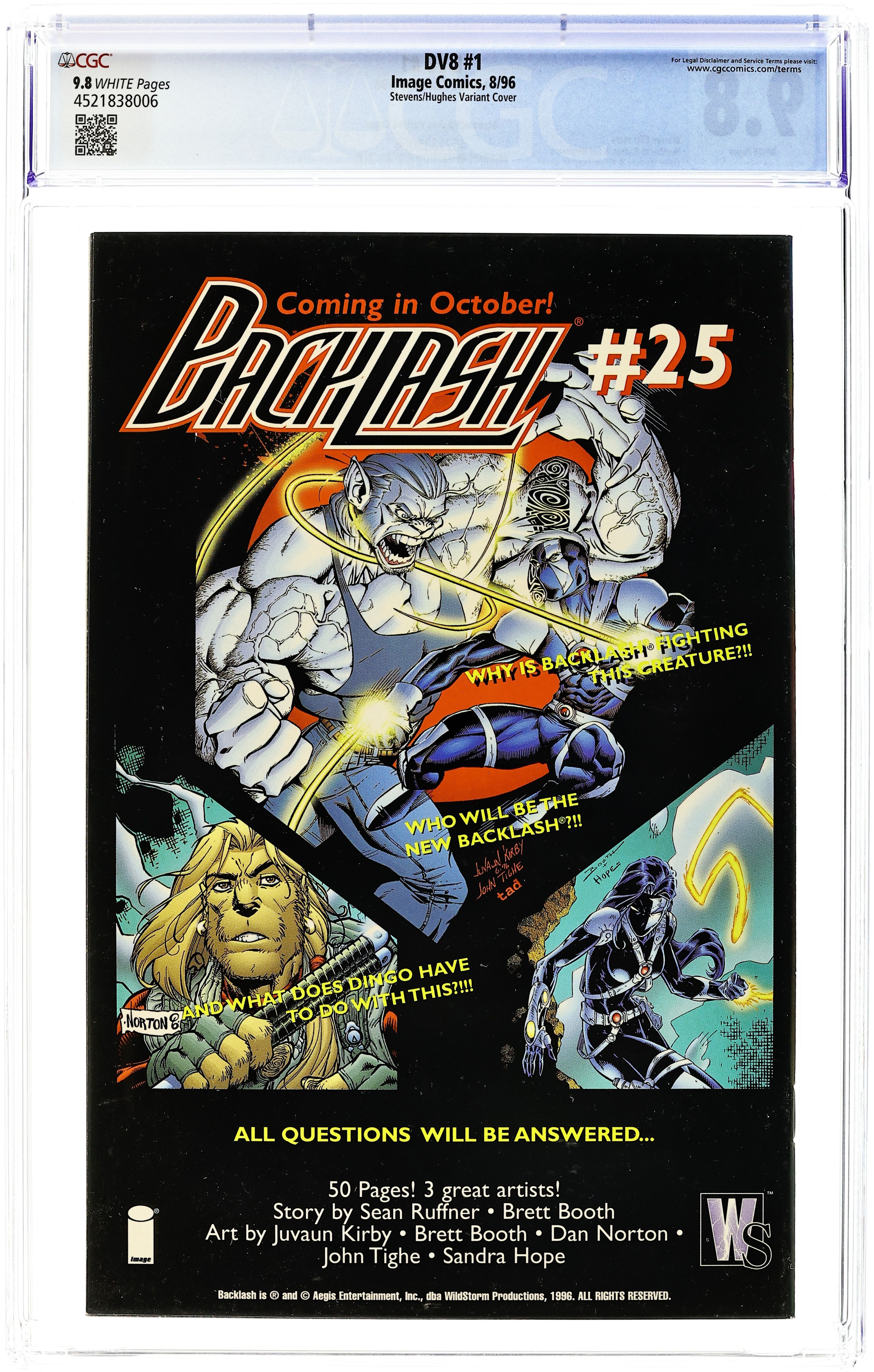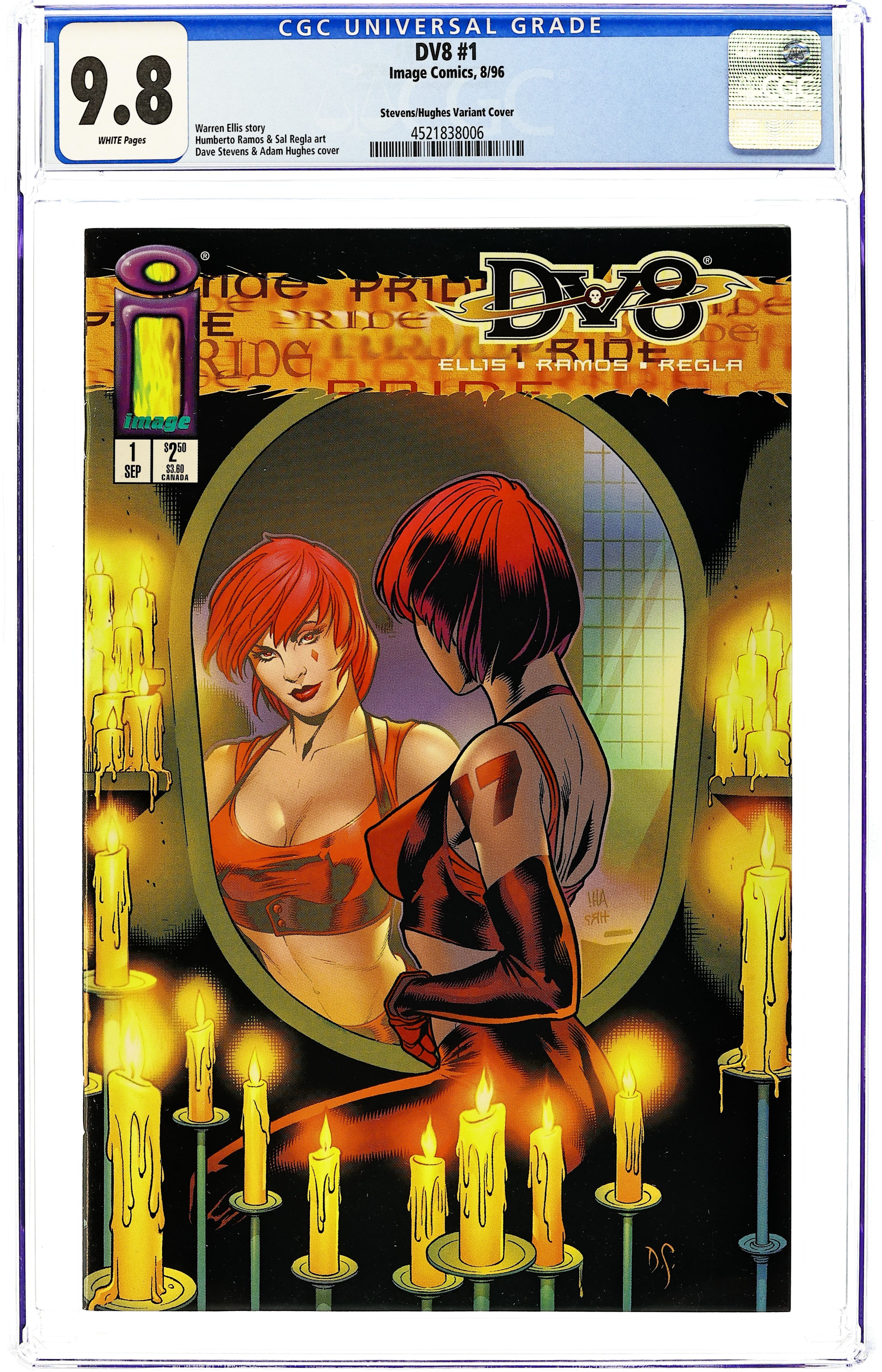 (Pride) cover by Dave Stevens and Adam Hughes. Lust For Life, script by Warren Ellis, pencils by Humberto Ramos, inks by Sal Regla, Troy Hubbs, and Peter Guzman (assist); DV8 settles down in New York City. The first mission is to bring back an alien from a C.I.A base. 36 pgs., full color. $2.50. Cover price $2.50. Grade: CGC 9.8 explanation of grade Condition: Used (collectible)