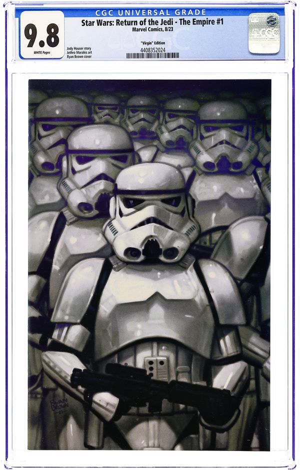 Ended May 26 2025 Winning Bid $61 Limited 1 for 100 Retailer Incentive Variant Cover. Written by Jody Houser. Art by Jethro Morales. Cover by Ryan Brown. WHAT WOULD YOU DO IF THE EMPIRE TOOK OVER? As operations begin to take shape on the moon of ENDOR, a technician must figure out how to live under the control of THE EMPIRE. But if he can't stay out of trouble, what will the Empire do with him? Continuing the 40TH ANNIVERSARY celebration of RETURN OF THE JEDI, JODY HOUSER & JETHRO MORALES pull back the curtain of the Empire like never before! 36 pages, full color. Rated T Cover price $4.99. Grade: CGC 9.8 explanation of grade Condition: Used (collectible)