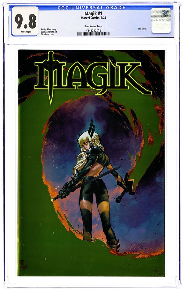Ended Jun 1 2025 Winning Bid $51 Foil Cover Written by Ashley Allen. Art by German Peralta. Cover by Dike Ruan. THE MYSTIC MUTANT GOES DEMON HUNTING IN HER OWN NEW, ONGOING SERIES! The X-Man Ilyanna Rasputina strikes out on her own with new allies and dark powers arrayed against her. Something ancient has awakened beneath the Alaskan ice. Unfortunately for it, that's Magik's territory now! Written by rising star Ashley Allen (X-MEN: BLOOD HUNT - MAGIK, MARVEL ZOMBIES: BLACK, WHITE & BLOOD) and illustrated by the incomparable Germán Peralta (LOKI, BLACK PANTHER), this is a stylish, high-octane demon-hunting adventure starring the fiercest X-Man of them all! 32 pages, full color. Rated T+ Cover price $4.99. Grade: CGC 9.8 explanation of grade Condition: Used (collectible) unless item is a new release
