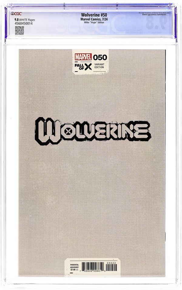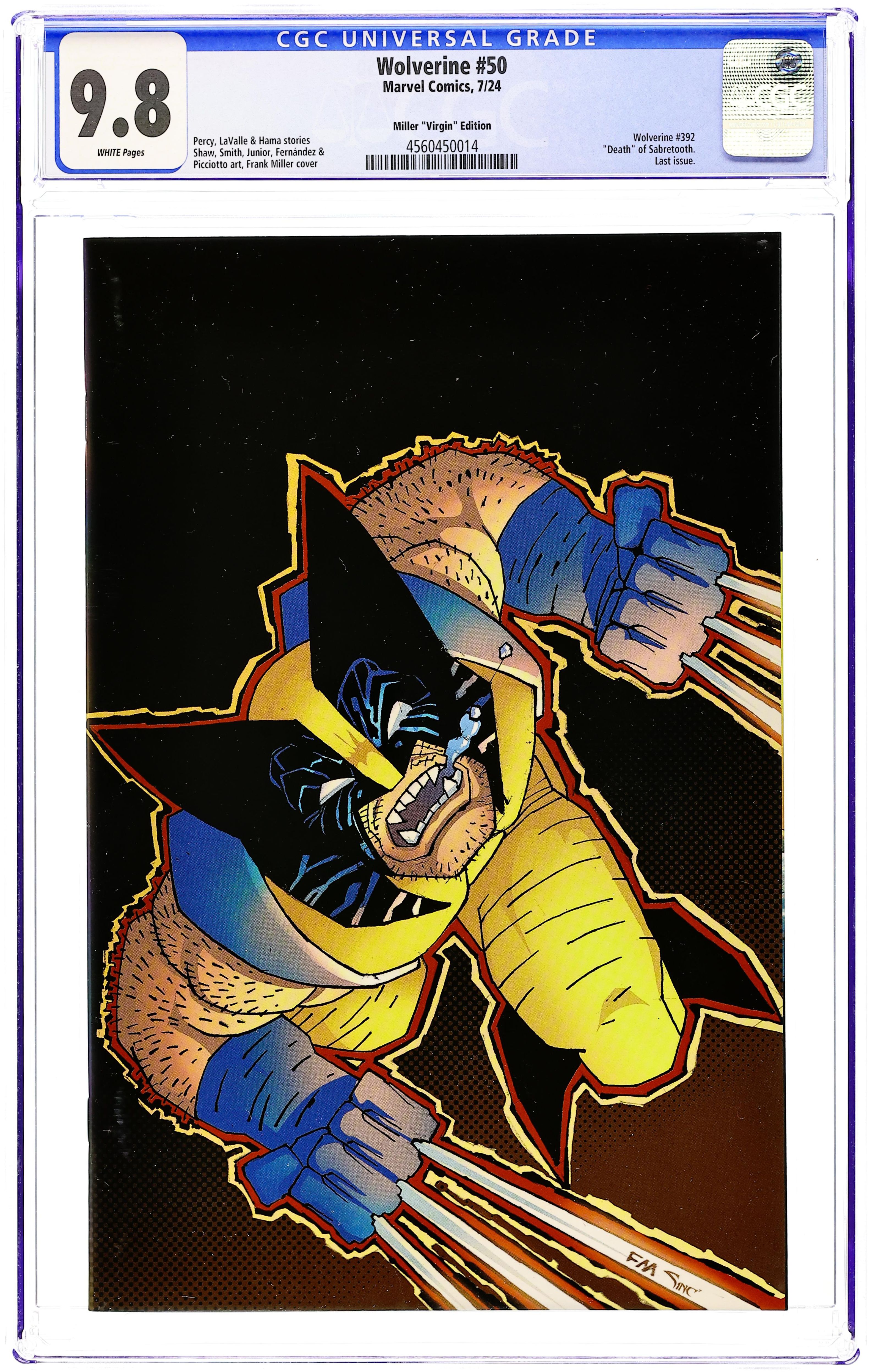 Ended Jun 3 2025 Winning Bid $78 Limited 1 for 200 Retailer Incentive Variant Cover. Written by Benjamin Percy; Victor LaValle. Art by Geoff Shaw; Cory Smith. Cover by Frank Miller. CREED VS. LOGAN - THE FINAL SHOWDOWN! It's all come down to this: the final battle between WOLVERINE and SABRETOOTH. The Sabretooth War concludes in the way it began - a violent, bloody battle - but WHO will be left standing? Plus: Special short stories celebrating fifty issues of this run and 50 YEARS OF WOLVERINE, from legendary Logan scribes including Larry Hama, as well as a final send-off from Benjamin Percy and Javi Fernández, and some special SURPRISES! 64 pages, full color. Rated Parental Advisory Cover price $7.99. Grade: CGC 9.8 explanation of grade Condition: Used (collectible)