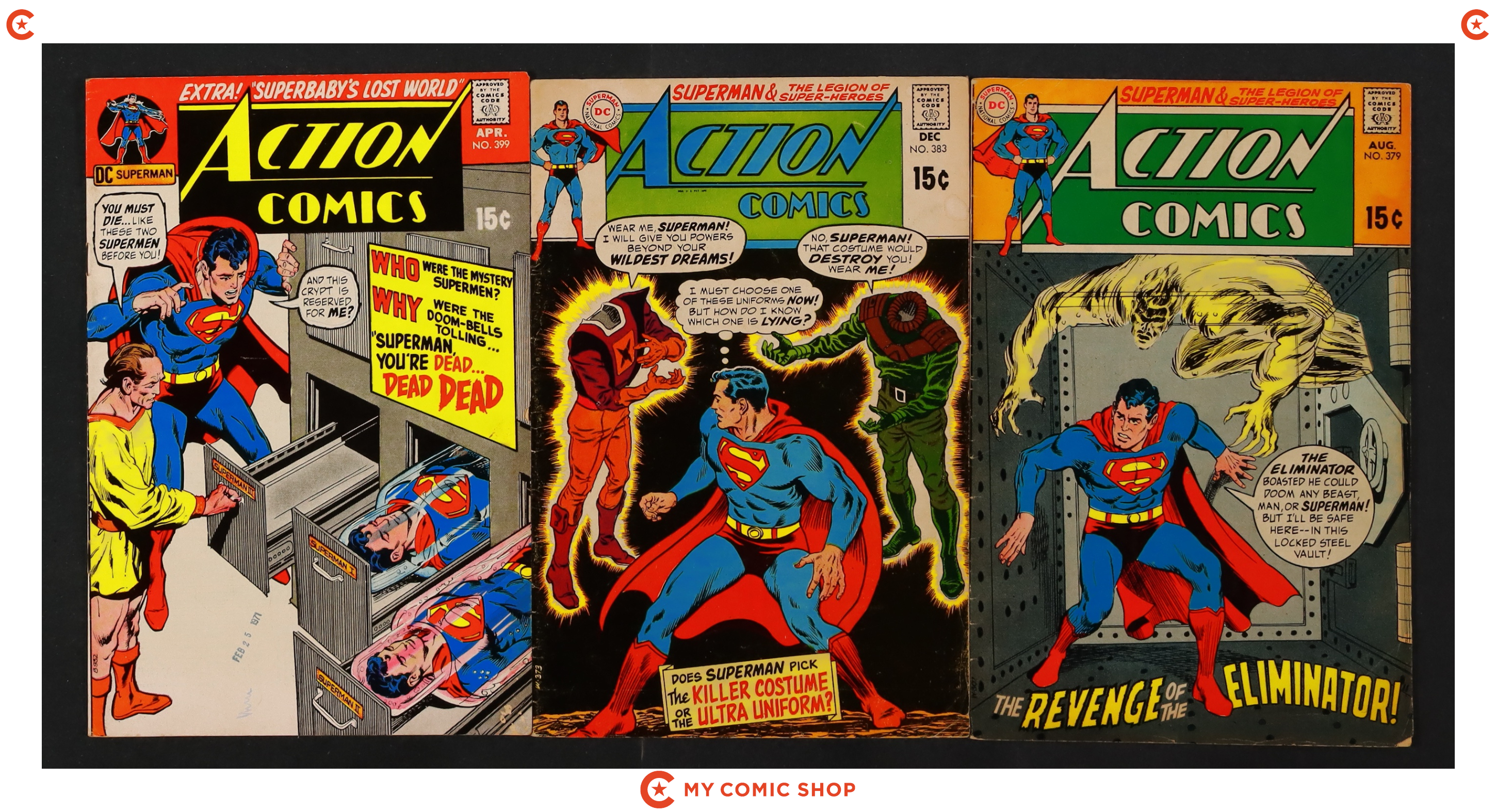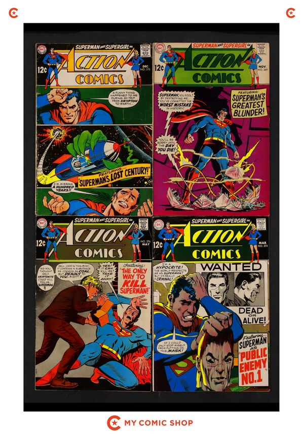 Issues 369, 370, 374, 376, 379, 383, and 399 of Action Comics (1938 DC). Most will grade in the VG range with a couple grading GD.
