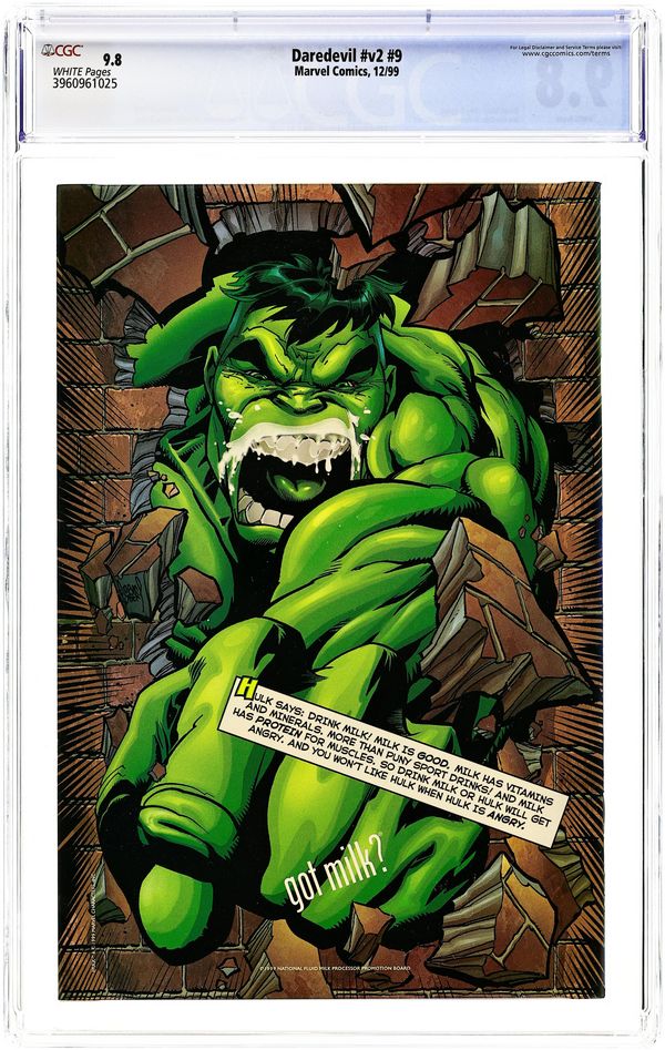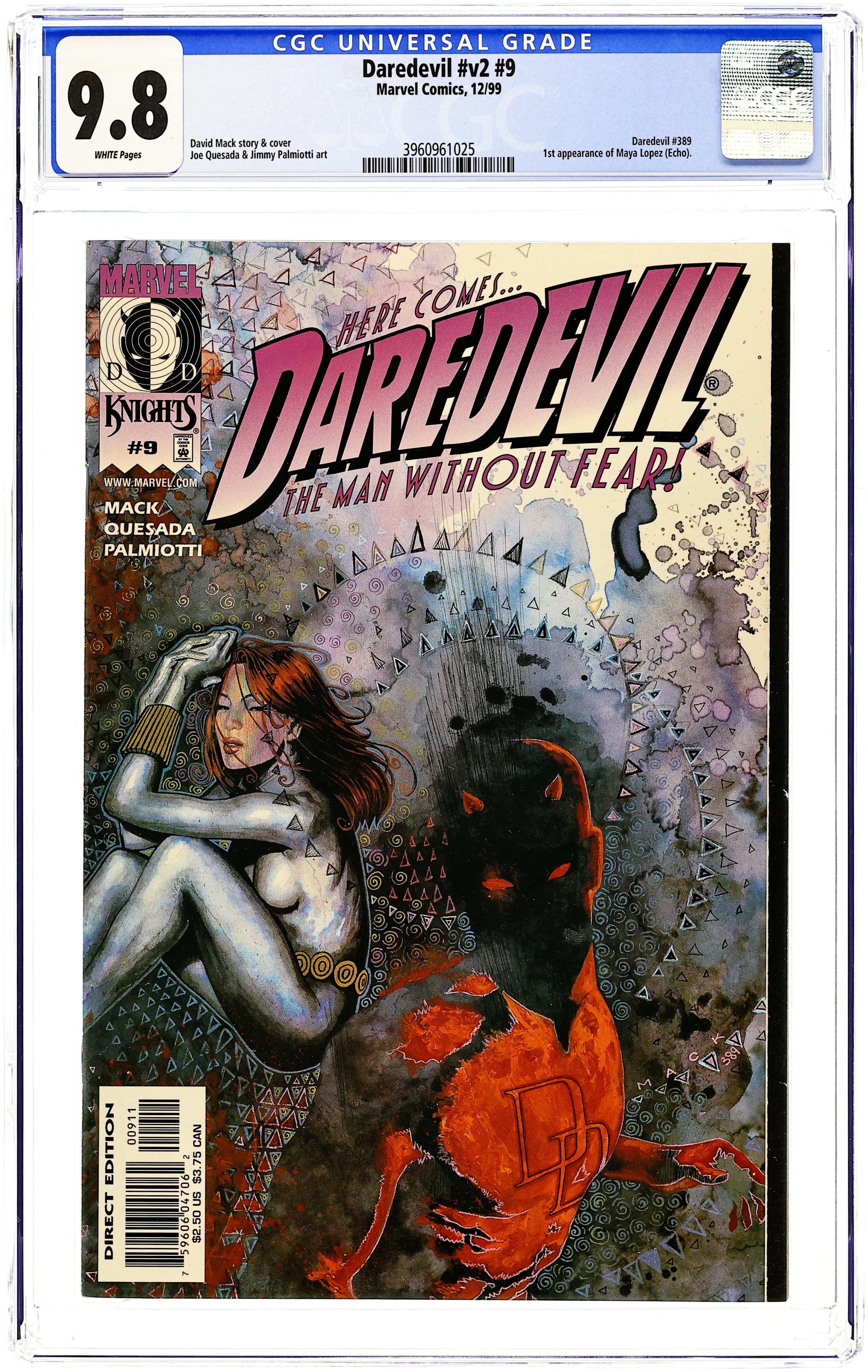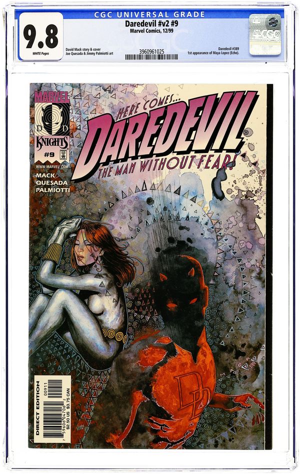 Direct Edition. Painted cover by David Mack. Joe Quesada and Jimmy Palmiotti welcome aboard new writer David Mack! As Matt Murdock attempts to rebuild his life from the ashes of the "Guardian Devil" story arc, old friends and new foes arrive! And when a mysterious man contacts Matt and claims to know the secret of Wilson Fisk's criminal empire, a new twist is added to the battle between Daredevil and his nemesis, the Kingpin!" Cover price $2.50. Grade: CGC 9.8 explanation of grade Condition: Used (collectible)