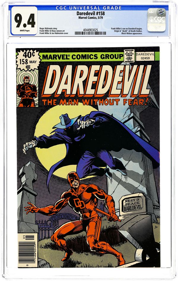 First Frank Miller Daredevil. First 40-cent cover price. Cover pencils by Frank Miller, inks by Joe Rubinstein. A Grave Mistake!, script by Roger McKenzie (Death-Stalker origin on page 7 plotted by Marv Wolfman), pencils by Frank Miller , inks by Klaus Janson.; Matt is captured by the Ani-Men and has a final showdown with Death-Stalker in a graveyard; the Unholy Three (Ape Man, Bird Man, Cat Man) appear. This issue contains a statement of ownership--average print run 393,978; average paid circulation 111.559. Miller/Joe Rubinstein cover. 36 pgs. Cover price $0.40. Cover price $0.40. Grade: CGC 9.4 explanation of grade Condition: Used (collectible)