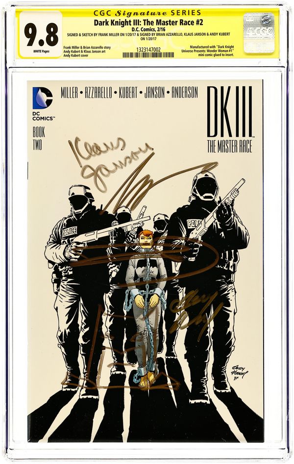 Written by Frank Miller and Brian Azzarello. Art and Cover by Andy Kubert and Klaus Janson. The unexpected finale to the Dark Knight saga continues as Carrie Kelly gets caught…that is, she finds herself…she gets into-well, you're just going to have to read it yourself. 36 pages, full color. Includes a bound-in, 12 page mini-comic (5 1/2-in X 8 1/2-in): Dark Knight Universe Presents: Wonder Woman #1 Cover price $5.99. Grade: CGC 9.8 explanation of grade Condition: Used (collectible)