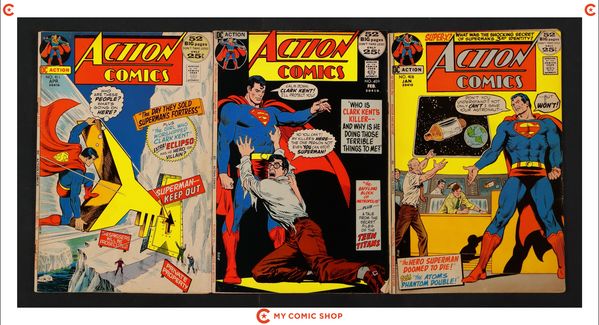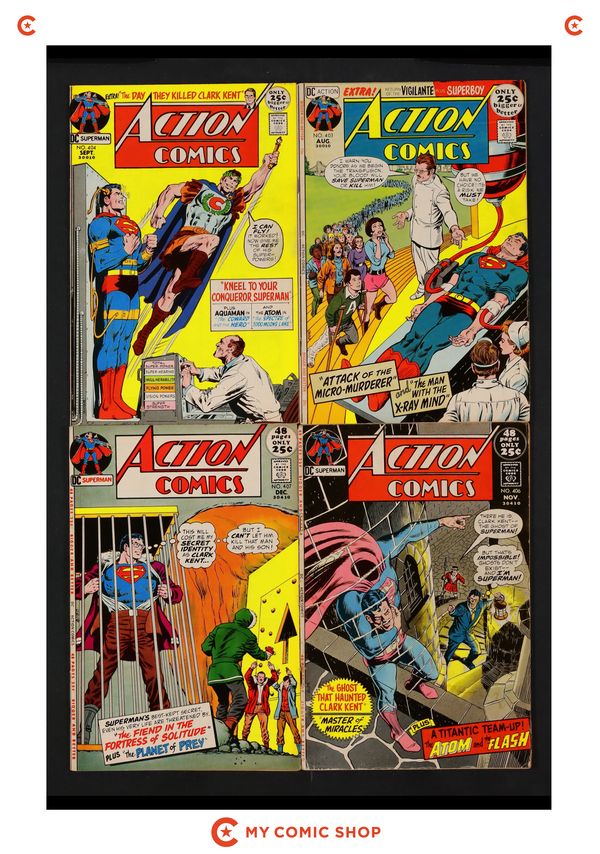 Issues 403, 404, 406-409, and 411 of Action Comics (1938 DC). Most will grade in the VG range with a couple grading GD.