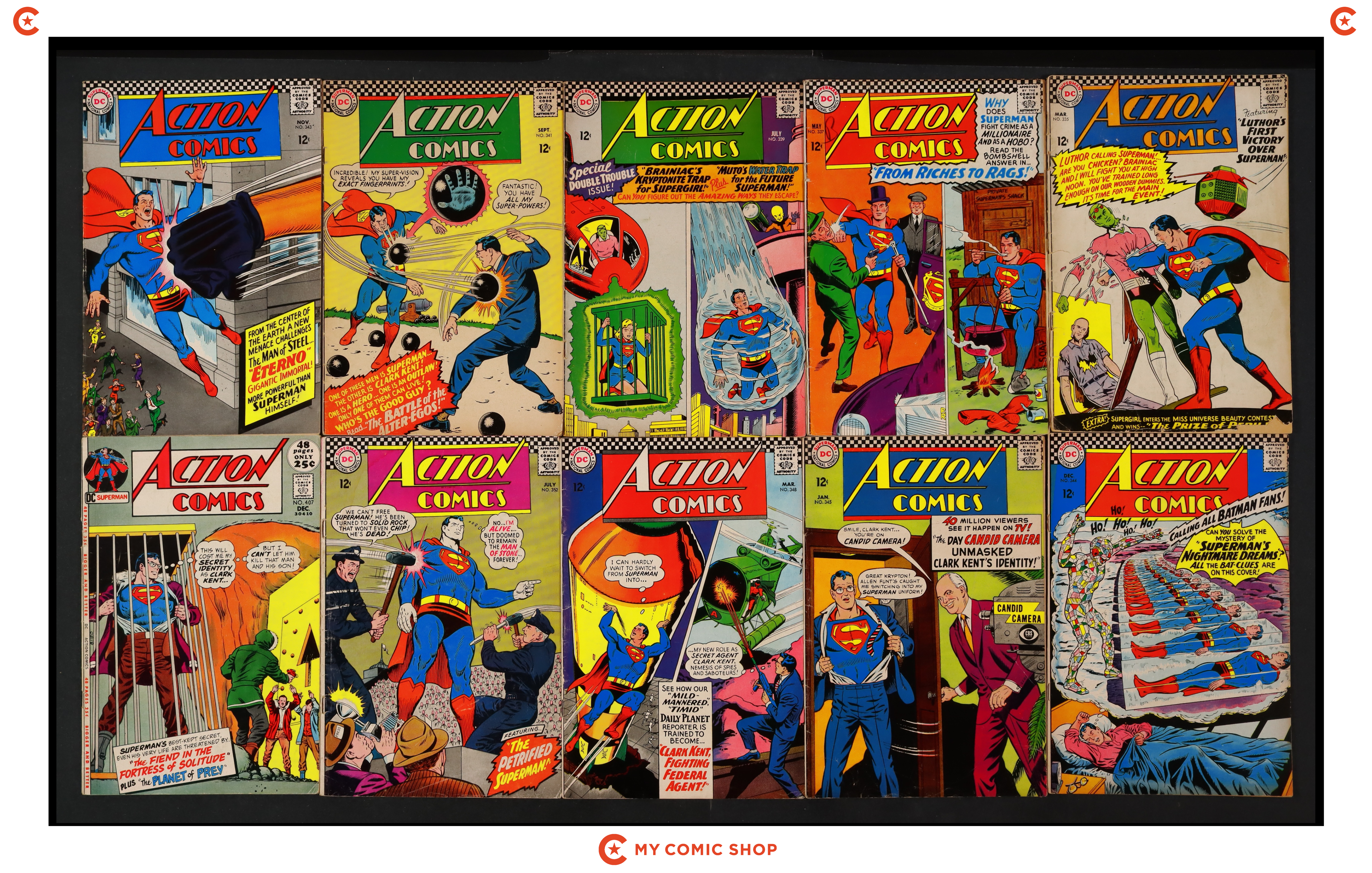 Issues 335, 337, 339, 341, 343-345, 348, 352, and 407 of Action Comics (1938 DC). Most will grade in the VG to GD range with #339 grading FR and #337 grading PR (centerfold missing, affects story and art).