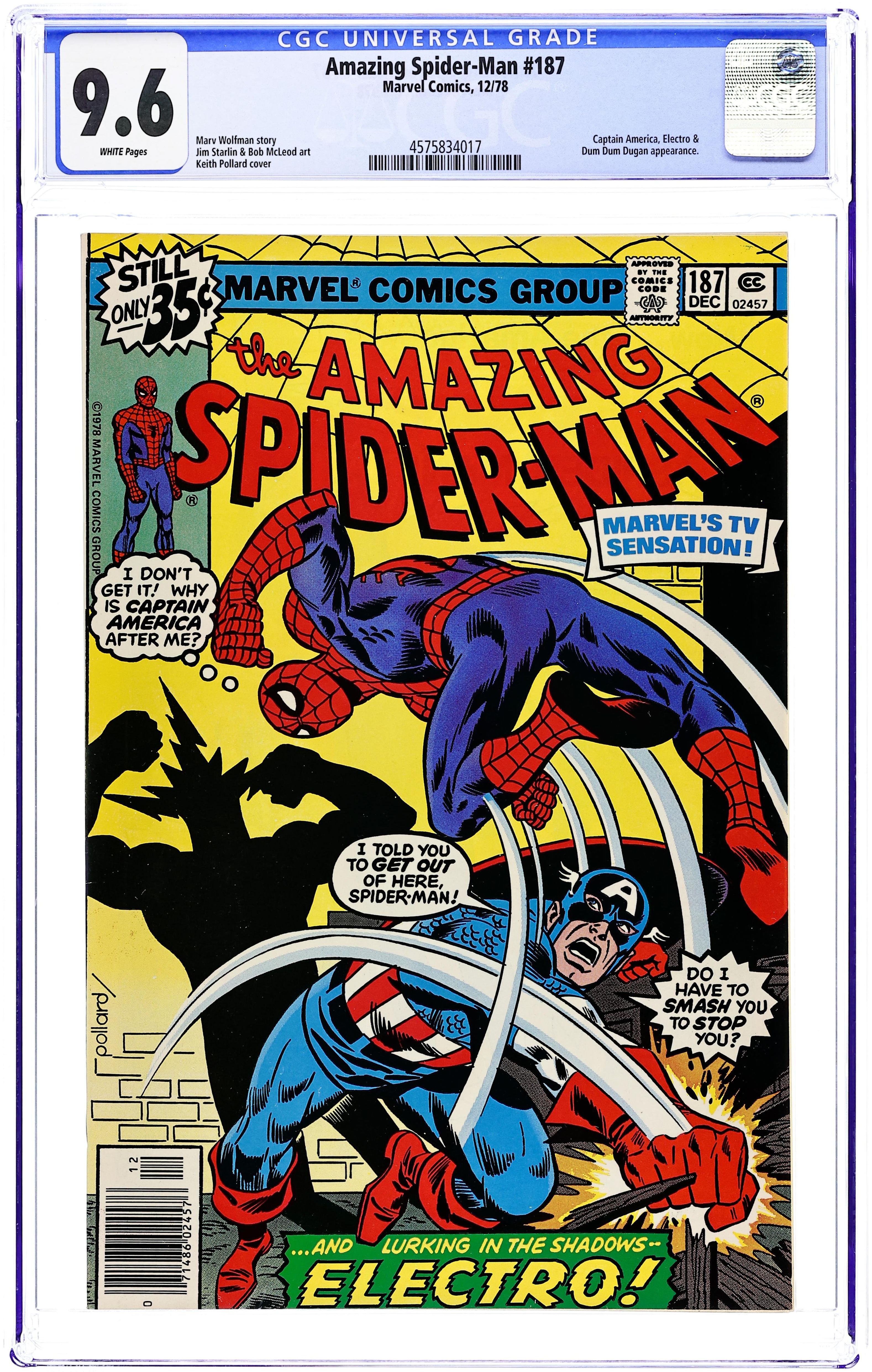Ended Jul 15 2025 Winning Bid $84 "The Power of Electro!" Guest-starring Captain America. Plot by Marv Wolfman and Jim Starlin. Script by Marv Wolfman. Brilliant art by Jim Starlin (layouts) and Bob McLeod (finishes). Cover by Keith Pollard. It's an overstuffed tale featuring the star-spangled avenger, web-slinger, SHIELD, Electro, and the bubonic plague! When the Daily Bugle receives a tip that authorities have cordoned off the neighborhoods surrounding the Indian Point Power Station, Jonah sends his ace photographer to investigate! The web-slinger easily slips past the SHIELD agents but runs into a problem after bumping into the Sentinel of Liberty! Cap wants the wall-crawler to leave the area ASAP! But Cap would think differently if he knew that an electrifying encounter awaits! The Amazing Spider-Man and Captain America vs. Electro! Cameo appearances by Dum Dum Dugan, J. Jonah Jameson, and Joe Robertson. (Notes: This is one of only three issues Jim Starlin drew for the Amazing Spider-Man title (1st series): issues 113, 114, and 187. More of Jim Starlin's artwork featuring Spider-Man can be seen in Marvel Two-in-One Annual 2. The web-slinger and Electro previously battled in Marvel Team-Up 56.) 36 pages Cover price $0.35. Grade: CGC 9.6 explanation of grade Condition: Used (collectible)