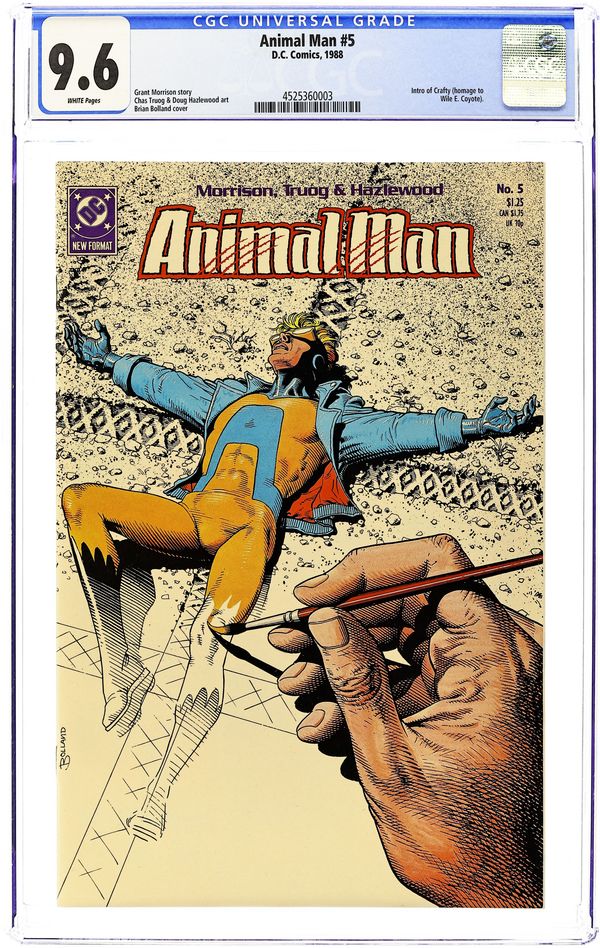 Cover art by Brian Bolland. The Coyote Gospel, script by Grant Morrison, pencils by Chas Truog, inks by Doug Hazlewood; Animal Man meets Crafty, a coyote that walks like a man and is painfully resurrected everytime it is killed. Suggested for Mature Readers. New Format. 36 pgs. $1.25. Cover price $1.25. Grade: CGC 9.6 explanation of grade Condition: Used (collectible)