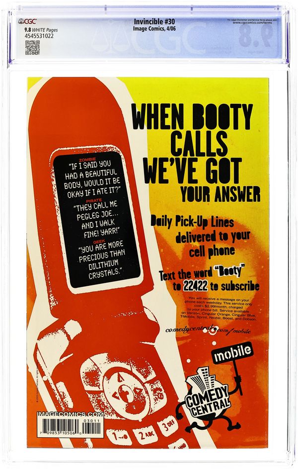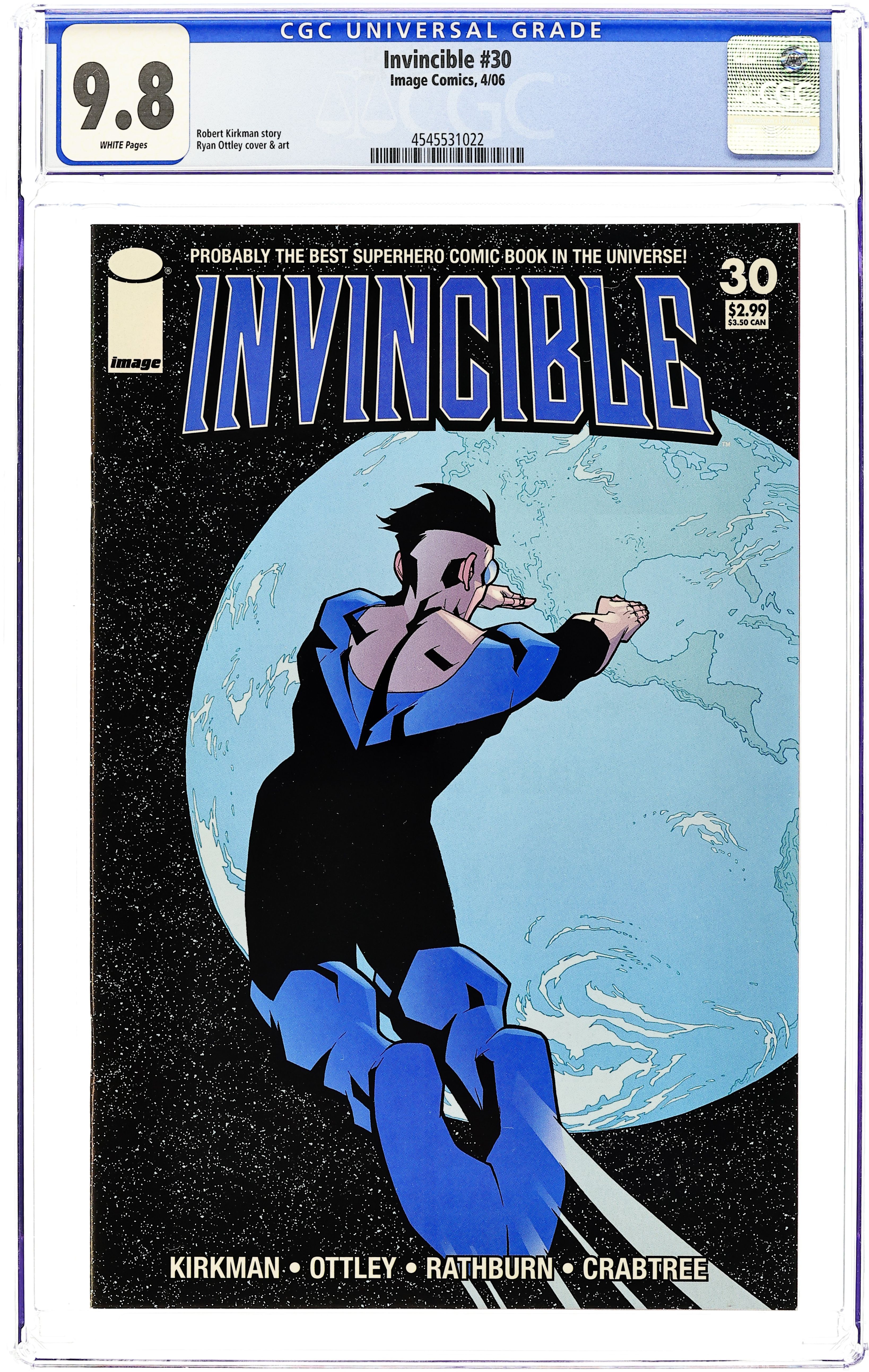 Written by ROBERT KIRKMAN. Art & cover by RYAN OTTLEY & BILL CRABTREE. "A DIFFERENT WORLD," Conclusion. Invincible returns home following the most life-changing and cataclysmic adventure of his life. But the home he returns to is changed forever. This issue sets the stage for the future of INVNINCIBLE. December 21 ? 32 pg ? FC ? $2.99 Cover price $2.99. Grade: CGC 9.8 explanation of grade Condition: Used (collectible)