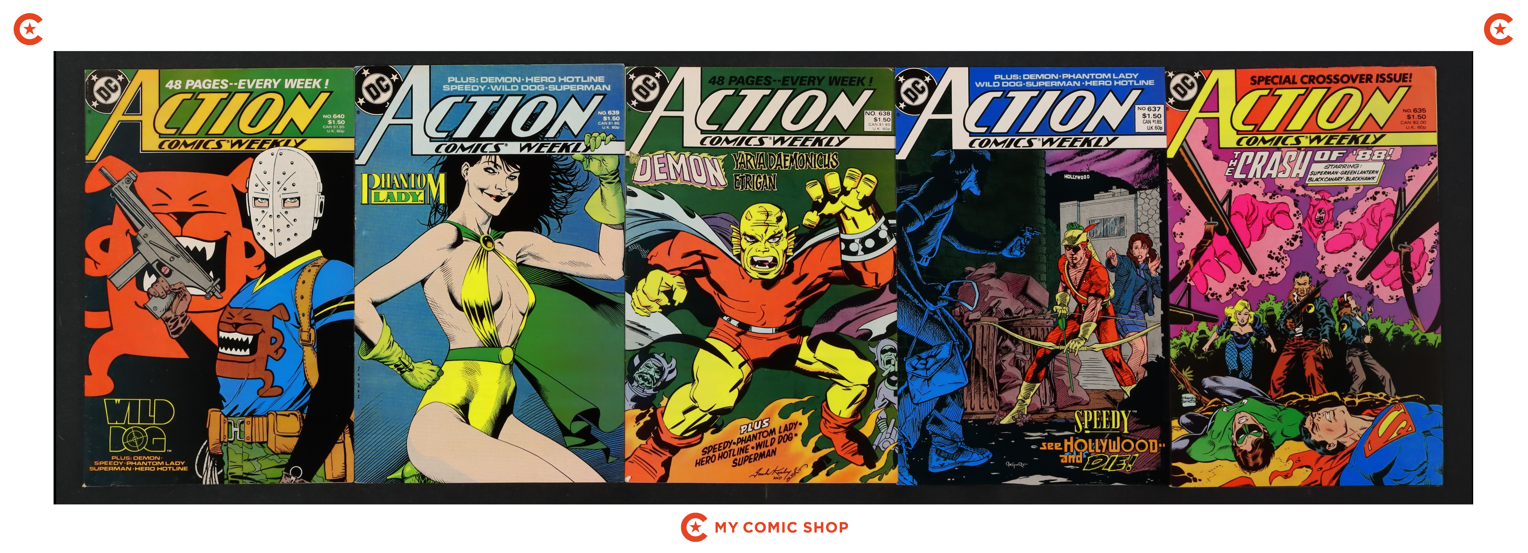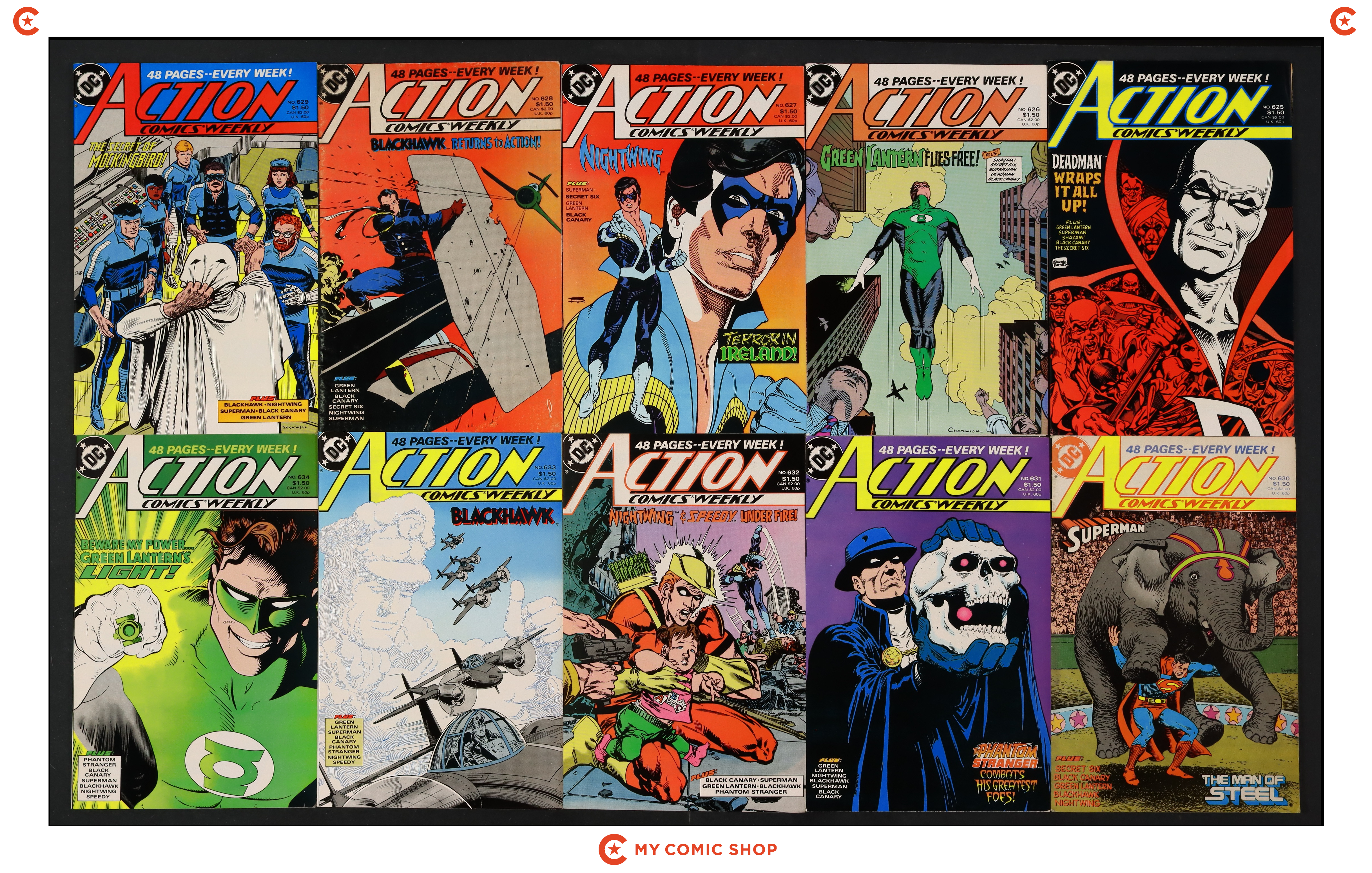 Issues 625-635 and 637-640 of Action Comics (1938 DC). Most will grade in the VF to FN range with a couple grading VG and #639 grading GD.