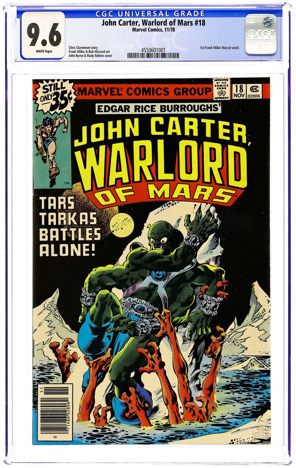Ended Jul 16 2025 Winning Bid $62 Frank Miller art (first published Marvel work). "Master Assassin of Mars, Part 3: Meanwhile, Back in Helium." Tars Tarkas wins a battle with Barak Sol, making Tarkas leader of the Tharks. Script by Chris Claremont, pencils by Frank Miller, inks by Bob McLeod. Cover by John Byrne and Rudy Nebres. Cover price $0.35. Grade: CGC 9.6 explanation of grade Condition: Used (collectible)