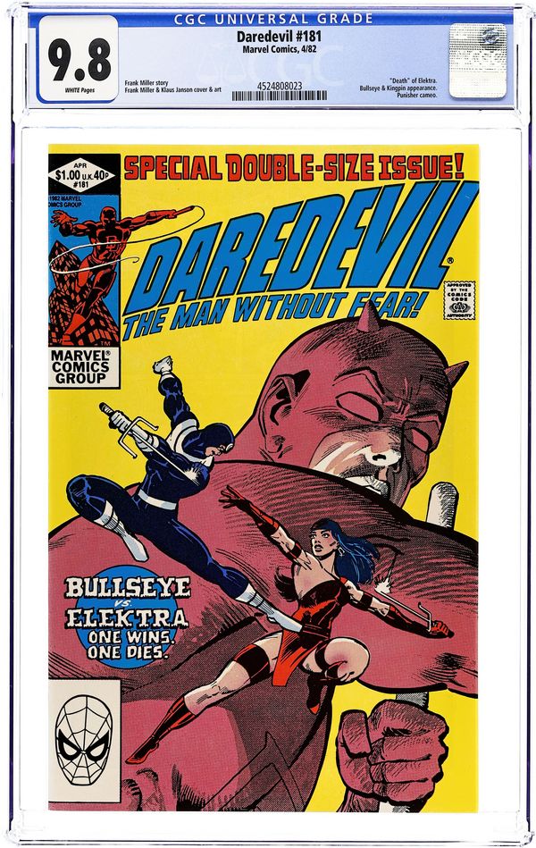 Ended Jul 17 2025 Bid History 9 bids Winning Bid $105 Direct Edition. Cover pencils by Frank Miller, inks by Klaus Janson. Last Hand, script by Frank Miller, pencils by Frank Miller (breakdowns) and Klaus Janson (finished art), inks by Klaus Janson; Bullseye breaks out of prison; Elektra hunts down Foggy and is about to kill him until she recognizes him as Matt's buddy from college; Bullseye fights Elektra and kills her with her own sai; DD goes after Bullseye and ends up dropping him from a great height, breaking every bone in his body; Kingpin appearance; story narrated by Bullseye; story dedicated to the memory of Wally Wood 1927-1981. Full page pin-up ad for Marvel Fanfare, art by Michael Golden. Statement of Ownership average # of copies in preceding 12 months: 276,812 Cover price $1.00. Grade: CGC 9.8 explanation of grade Condition: Used (collectible)