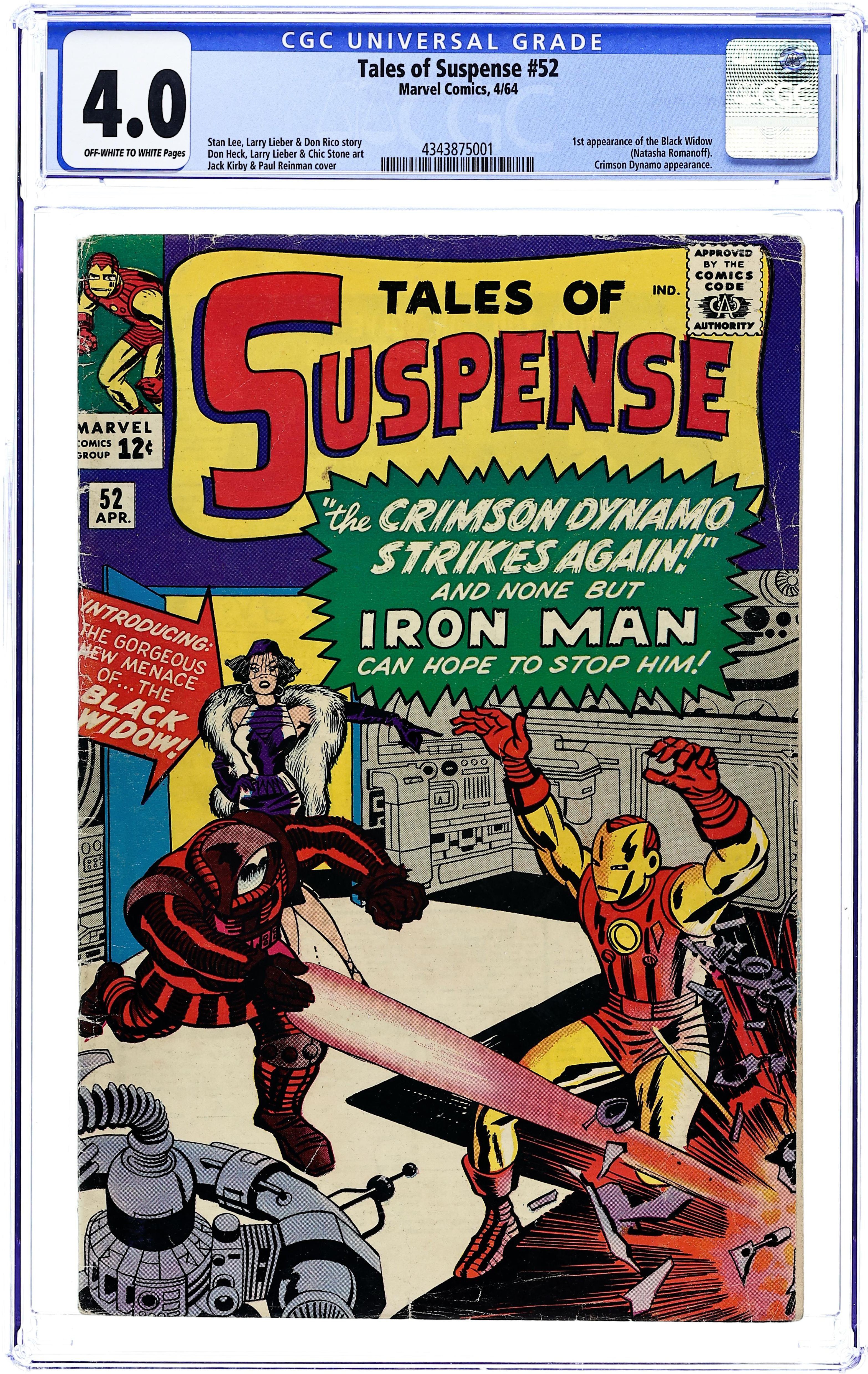 Ended Jul 16 2025 Winning Bid $476 Cover pencils by Jack Kirby, inks by Paul Reinman. First appearance of the Black Widow in "The Crimson Dynamo Strikes Again!", script by Stan Lee (plot) and Don Rico (as N. Korok), art by Don Heck; The Black Widow and Boris are sent to America to kill Anton Vanko, the Crimson Dynamo, for defecting to America; They are also tasked with killing both Iron Man and Tony Stark. The first half of "The Magician" text story. "The Seance!", script by Stan Lee (plot) and Larry Lieber, pencils by Larry Lieber, inks by Chic Stone; A fake medium uses special effects to simulate supernatural powers, but he is taken into the spirit world by real ghosts as punishment. "The Failure!", script by Stan Lee (plot) and Larry Lieber (script), pencils by Larry Lieber, inks by Paul Reinman; The Earth of the future is overwhelmingly materialistic, except for one idealistic young man and his lover; They are abducted by aliens, who have determined that he is the best suited to be absolute ruler of their empire. This issue includes a statement of ownership - average print run, 318,932; average paid circulation, 188,005. 36 pages, full color. Cover price $0.12. Grade: CGC 4.0 explanation of grade Condition: Used (collectible)