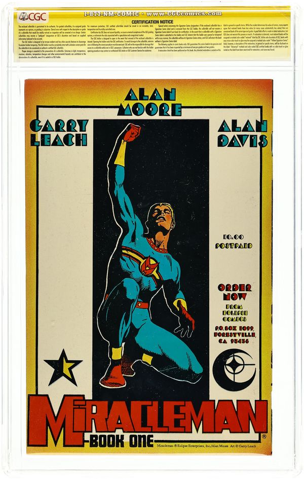Ended Jun 9 2025 Winning Bid $57 Olympus - Written by Alan Moore. Art and Cover by John Totleben. Alan Moore bids farewell to the series! Characters in this issue: Miracleman, Warpsmiths (Phon Mooda, Llans Ivo, Uxu Chil, Hrin Lulli, Kana Blur), Miraclewoman, Firedrake, Margaret Thatcher, Cecil Parkinson, Mors (introduction), Big Ben (becomes the British Bulldog), Mike Moran (in underspace), Kid Miracleman (in underspace), Fenris (Miracledog), Winter Moran, Liz Moran, George Bush, Muammar Gaddafi and Jerry Fallwell. 32 pages, full color. Cover price $1.95. Grade: CGC 9.4 explanation of grade Condition: Used (collectible)