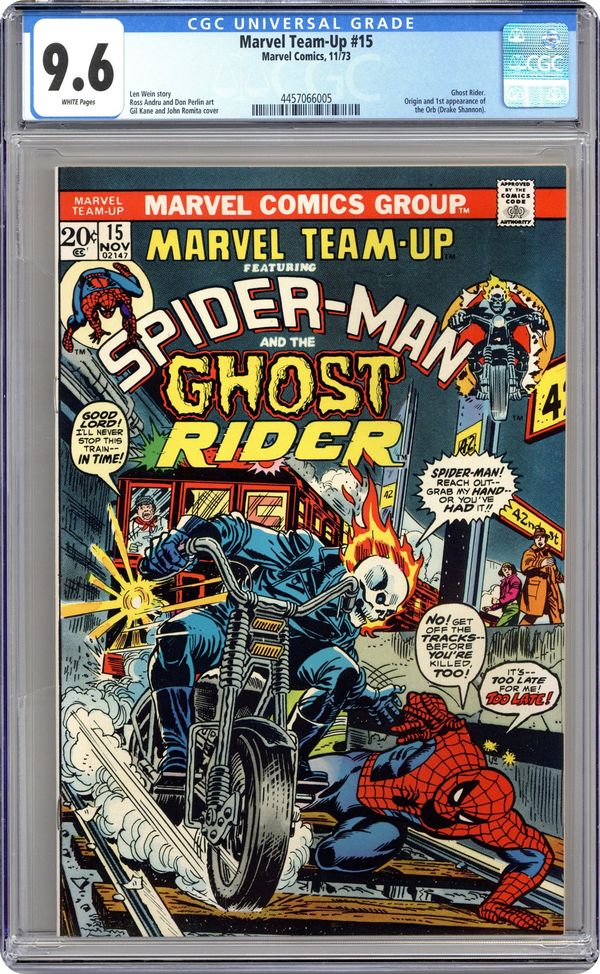 Spider-Man and Ghost Rider in "If An Eye Offend Thee." Script by Len Wein. Pencils by Ross Andru. Inks by Don Perlin. Cover by Gil Kane, Frank Giacoia, and John Romita. Spider-Man and Ghost Rider battle the Orb. First meeting between Spider-Man and Ghost Rider. Origin and first appearance of the Orb. The Orb appears next in Ghost Rider (1st series) 14. This issue was first reprinted in Marvel Treasury Edition 18 and Marvel Tales 254. 36 pages. Cover price $0.20. Grade: CGC 9.6 explanation of grade Condition: Used (collectible)