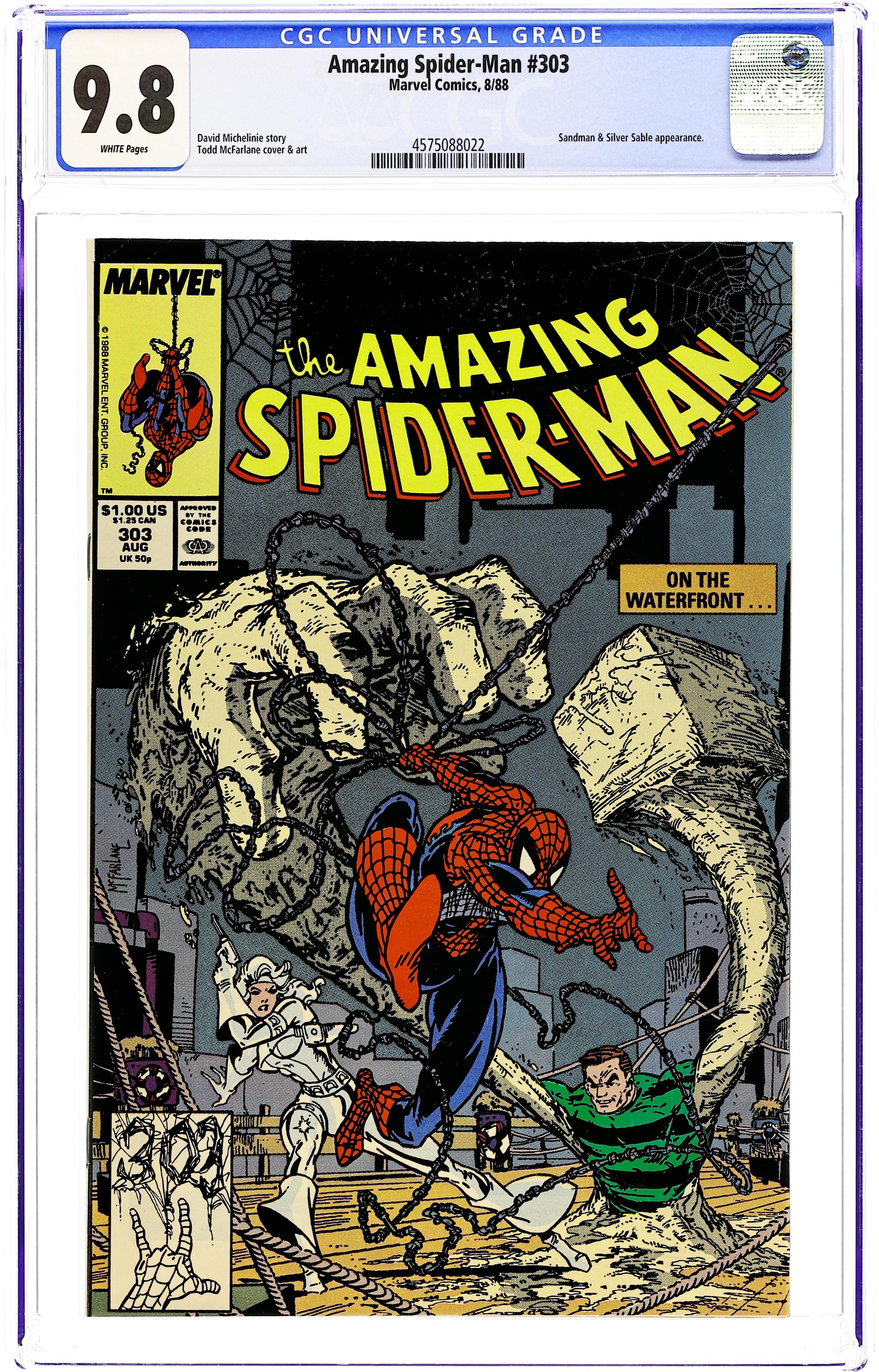 Direct Edition. "Dock Savage!" Guest-starring Silver Sable. Script by David Michelinie. Art by Todd McFarlane. Cover by Todd McFarlane. While trying to make up his mind about the research company's job offer in Kansas, the wondrous wall-crawler receives another employment offer! However, this one is from Silver Sable and requires brawn not brains! The Symkarian mercenary wants Spider-Man to team up with the Sandman to take down a neo-nazi and his private army! The web-slinger quickly accepts sable's offer and swings into action! As for the other offer, your friendly neighborhood Spider-Man has to talk to his wife first! Cameo appearances by Mary Jane Watson and J. Jonah Jameson. (Notes: Beginning with this issue, Todd McFarlane produces small drawings in the UPC box on the front cover. These sketches only appear on the cover of the direct sales issues. The newsstand editions have the regular bar code.) 36 pgs. Cover price $1.00. Grade: CGC 9.8 explanation of grade Condition: Used (collectible)