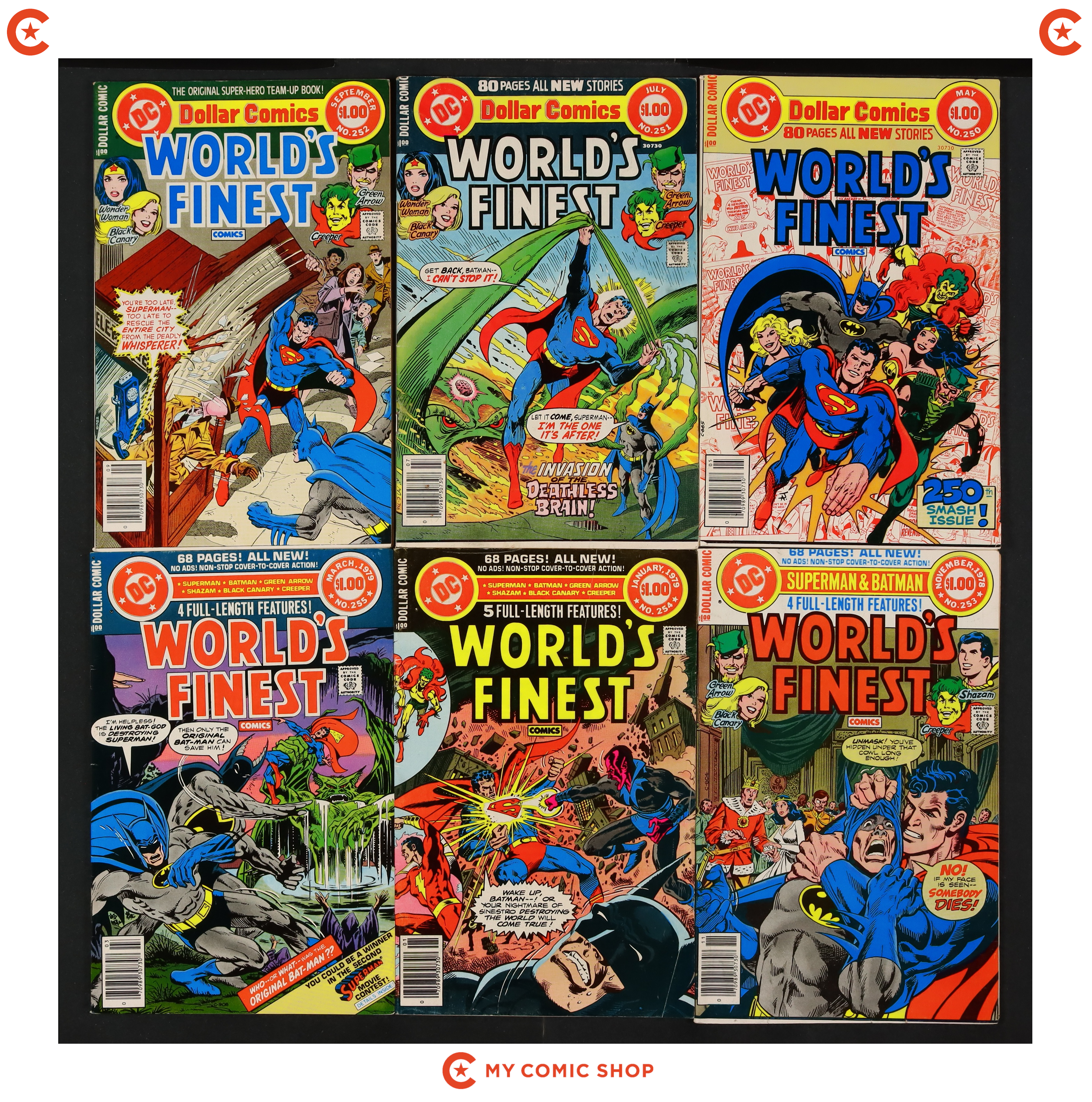 Issues 250-256, 259, 267, 268, 277, and 278 of World's Finest (1941). Most will grade in the FN to VG range with some grading GD.