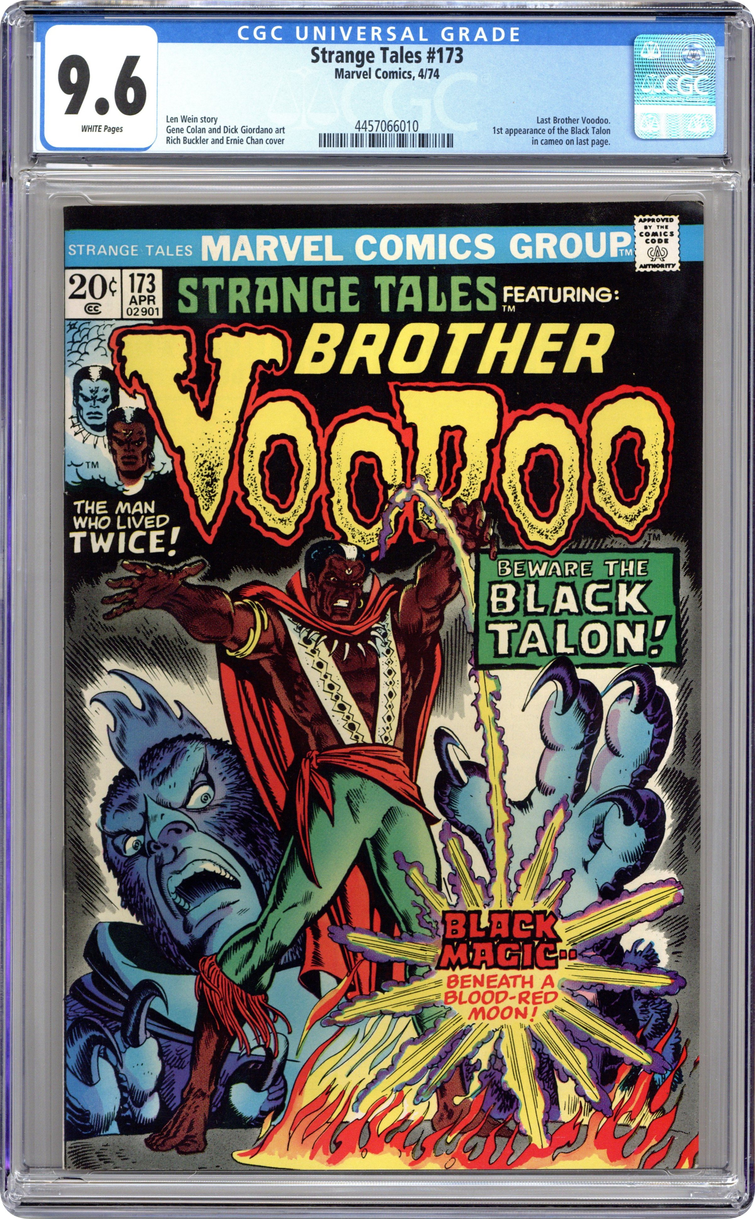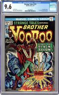 Last 20-cent cover price. Cover inks by Ernie Chan. "Sacrifice Play," script by Len Wein, pencils by Gene Colan, inks by Dick Giordano; To aid in his mission to try and find Loralee Tate, Brother Voodoo pays a visit to an old woman named Mama Limbo who apparently has clairvoyant abilities; Her visions tell him to go and seek out Desmond Drew, who she believes has a connection to the Cult of the Darklord; As Brother Voodoo goes to check out this lead, at the police station Samuel Tate and Pete Hawkins debate on what to do about Samuel's missing daughter; They finally decide that Brother Voodoo would hamper their efforts to find her themselves and put out an APB to have him arrested on sight. "Bait," art by Manny Stallman; Scientists on board a fishing boat haul up a creature from the bottom which threatens to expand to colossal size, but the captain of the boat cuts it up before this can happen to use as chum for better fishing. Final appearance of Brother Voodoo in this title; the story continues in Tales of the Zombie 6. The letters page contains Marvel Value Stamp series A #45 (Mantis). Ad for Fantastic Four #145. 36 pgs., full color. Cover price $0.20. Grade: CGC 9.6 explanation of grade Condition: Used (collectible)
