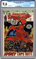 "Spidey Cops Out!" Script by Gerry Conway. Pencils by John Romita. Inks by John Romita and Tony Mortellaro (backgrounds). Cover by John Romita. Peter Parker is desperately searching for his dear Aunt May! She has been missing for several days now, and her web-slinging nephew is worried sick. In fact, Spider-Man passes on a few crime-busting activities in order to find her. Unfortunately, the Daily Bugle gets wind of the wall-crawler's newfound indifference, and JJJ pounces! But Peter doesn't care as he continues his search. On the Lower East Side, the web-slinger's spider-sense goes off! Has Spider-Man found his aunt? Not unless May Parker has suddenly added four mechanical arms! Cameo appearances by the Gibbon, Harry Osborn, Betty Brant, Joe Robertson, Mary Jane Watson, Anna Watson, Flash Thompson, Gwen Stacy, and Dr. Octopus. (Notes: John Romita is credited as a co-plotter of the story. This issue was reprinted in Marvel Tales #91.) 36 pages. Cover price $0.20. Grade: CGC 9.6 explanation of grade Condition: Used (collectible)