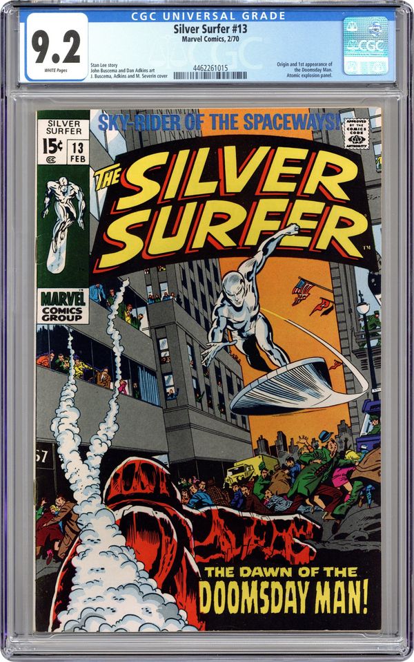 "The Dawn of the Doomsday Man!" Written by Stan Lee. Art by John Buscema and Dan Adkins. The ground rumbles and the citizens of New York City tremble in fear as the monstrosity known as the Doomsday Man rise from the bowels of the earth. Only the Silver Surfer, a being whom the people of Earth have ridiculed and alienated time and again, can save them now. Cover price $0.15. Grade: CGC 9.2 explanation of grade Condition: Used (collectible)