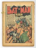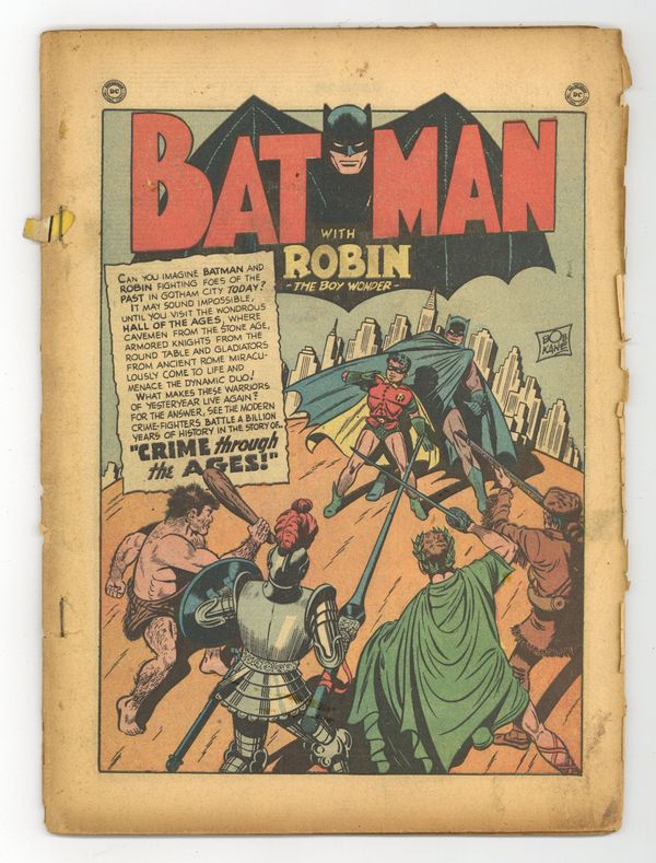 Cover by Jim Mooney. Crime Through the Ages!, pencils by Dick Sprang, inks by Charles Paris; , Bruce Wayne, a member of the directors of the Gotham Museum, proposes to create a building in which every floor of the construction will feature a recreation of important historic eras; The building is forced to close because of several accidents; Batman and Robin investigate. -page Shorty story by Henry Boltinoff. The Counterfeit Batman!, script by Bill Finger, pencils by Dick Sprang, inks by Charles Paris; Crime boss Shark Marlin goes to Wayne Manor and blackmails Bruce into impersonating Batman to drive away his rival gang; With Dick's life in danger, Bruce has no choice but to agree; When Marlin gets suspicious of Bruce, he prepares a trap to discover is Bruce is actually Batman. One-page Casey the Cop story by Henry Boltinoff. The Men Behind the Men in White text article. -page Casey the Cop story by Henry Boltinoff. Dog Show one-page story, script by Stookie Allen. The Auto Circus Mystery!, pencils by Bob Kane (Batman and Robin figures only) and Lew Sayre Schwartz, inks by Charles Paris; A car stealing racket begins operating in Gotham City; Commissioner Gordon has Batman investigate the case of the stolen cars. Half-page Daffy & Doodle story. Job Counselor public service announcement starring Superboy, script by Jack Schiff, art by Win Mortimer. 52 Pages, Full Color. Cover price $0.10. Grade: Coverless explanation of grade Condition: Used (collectible)