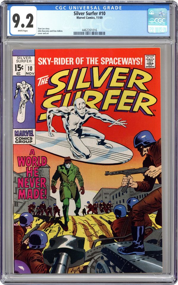 "A World he Never Made!" Part 1 of 2. Written by Stan Lee. Art by John Buscema and Dan Adkins. In an effort to better understand mankind, the Silver Surfer ventures among them, incognito. Cover price $0.15. Grade: CGC 9.2 explanation of grade Condition: Used (collectible)