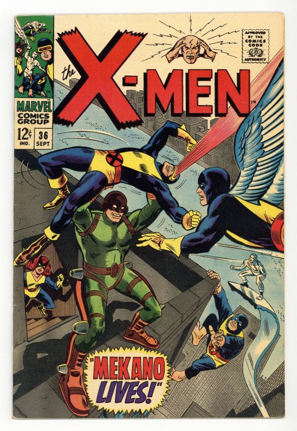 Ended May 20 2025 Winning Bid $69 Cover pencils by Ross Andru, inks by George Roussos. Mekano Lives!, script by Roy Thomas, pencils by Ross Andru, inks by George Roussos [as George Bell]; the X-Men try to make money to go to Europe, where the Factor Three is; they battle Mekano and save the Central Library; First full appearance of Merkano. 36 pgs. $0.12. Cover price $0.12. Grade: FN- 5.5 explanation of grade Condition: Used (collectible)