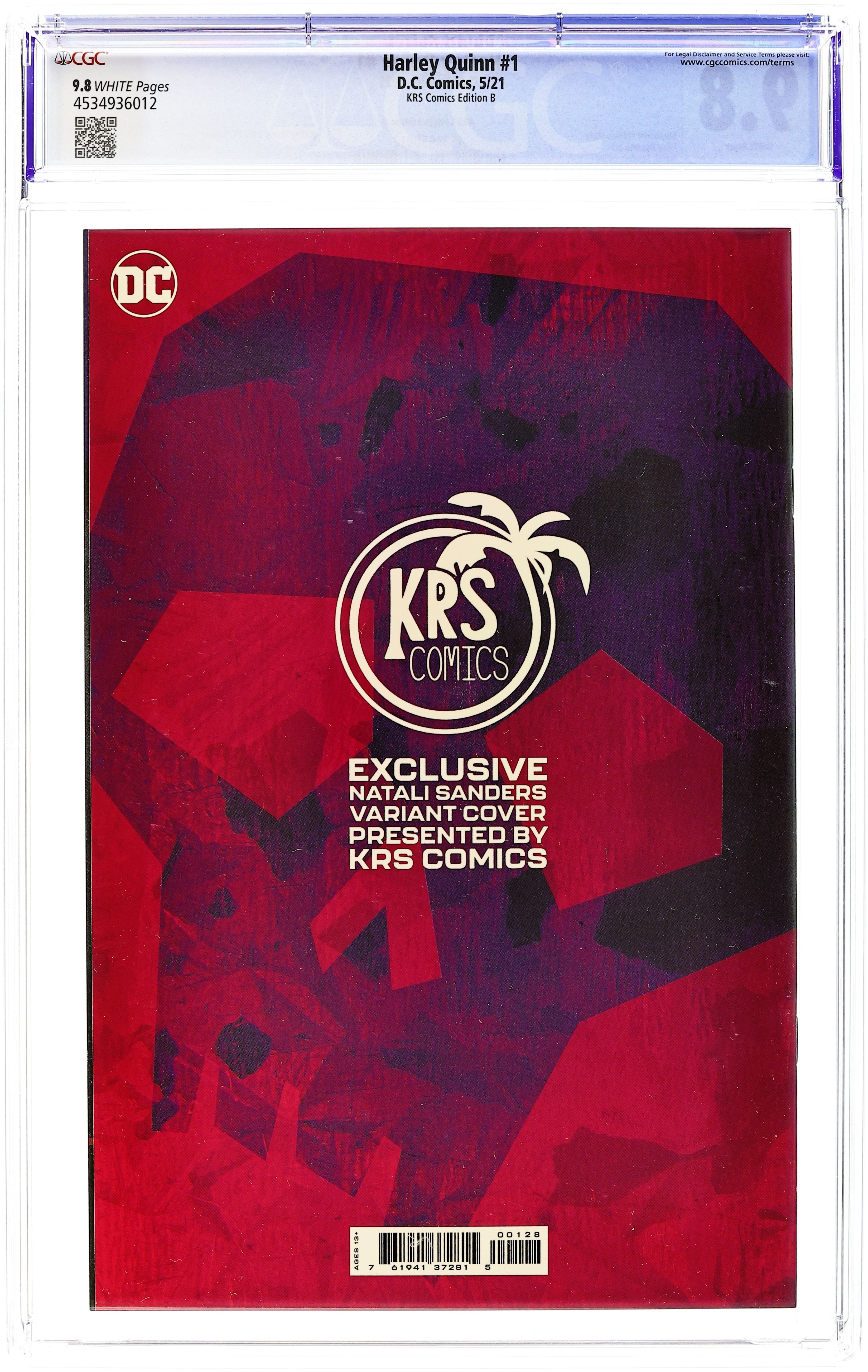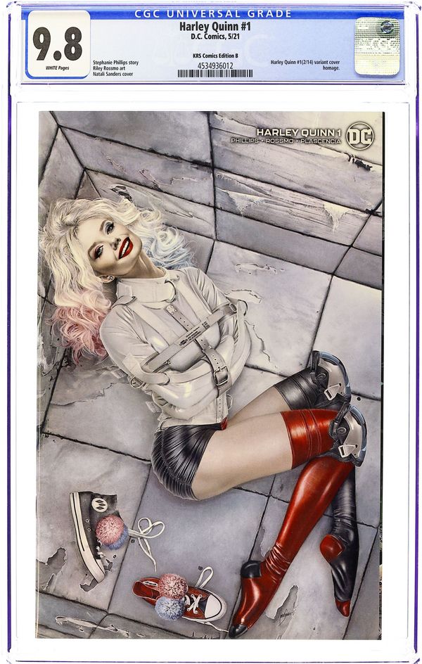 Black Flag Comics exclusive cover by Natali Sanders. Written by Stephanie Phillips. Art by Riley Rossmo. Ahem! You better read this closely, cause weve got a red-hot relaunch on our hands hereāand I should know! Harley Quinn here to let everyone know that I got a brand-new monthly series here with a brand-new status quo. Im coming back to Gotham City to make up for the sins of my past, and help the city recover from The Joker War! But theres no welcoming committee waiting for me, your favorite Maid of Mischief! And between you and me, some real creeps are working to keep the city broken. We cant let that happen, can we? Rising-star writer Stephanie Phillips, my new partner in crime, takes me into a bold new era with her partner in artistic crime Riley Rossmo, who I gotta say designed a real nice new costume for me. Youre not gonna wanna miss this one, folks! 32 pages, full color. Rated T+ Grade: CGC 9.8 explanation of grade Condition: Used (collectible)