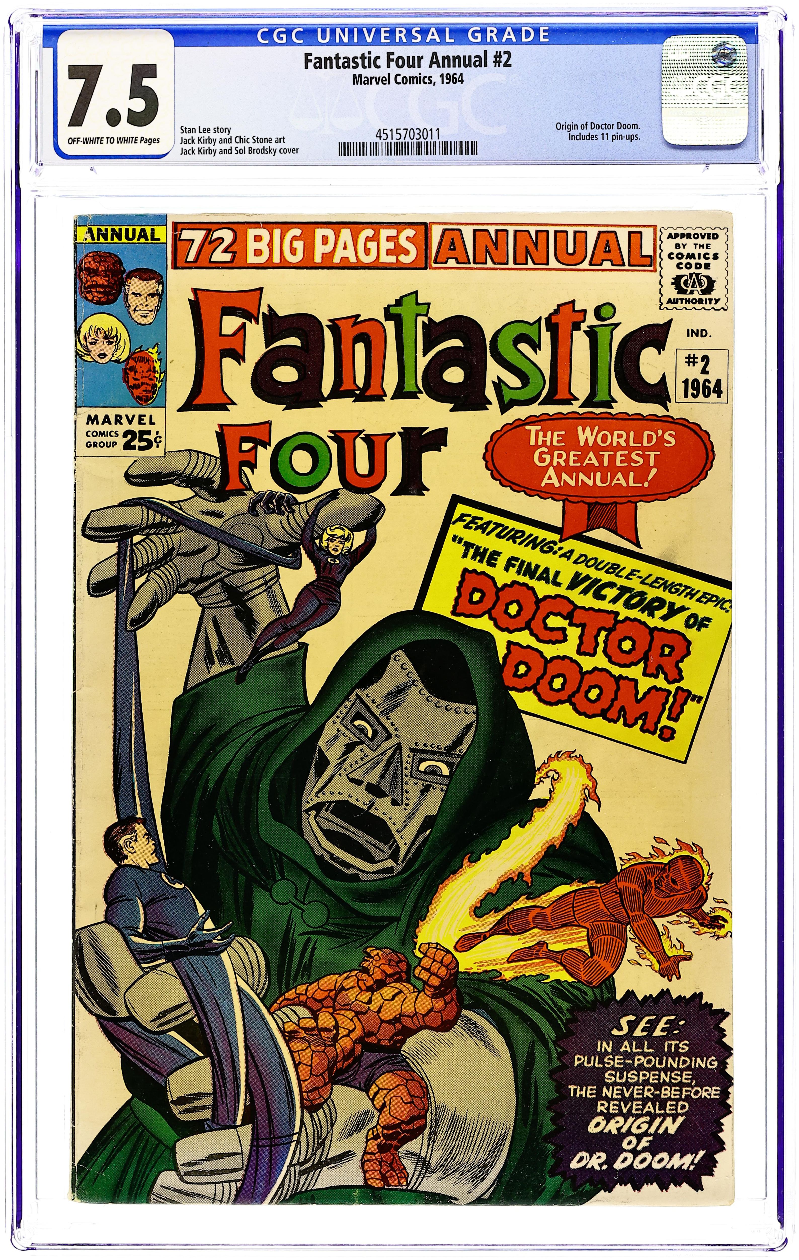 2 new Doctor Doom stories, "Origin of Doctor Doom!" and "The Final Victory of Dr. Doom!" Scripts by Stan Lee, pencils by Jack Kirby, inks by Chic Stone. Six pages of pin-ups by Kirby/Sol Brodsky. This issue also reprints "Prisoners of Doctor Doom" (from FF 5). Kirby/Stone cover. 76 pgs. Cover price $0.25. Grade: CGC 7.5 explanation of grade Condition: Used (collectible)