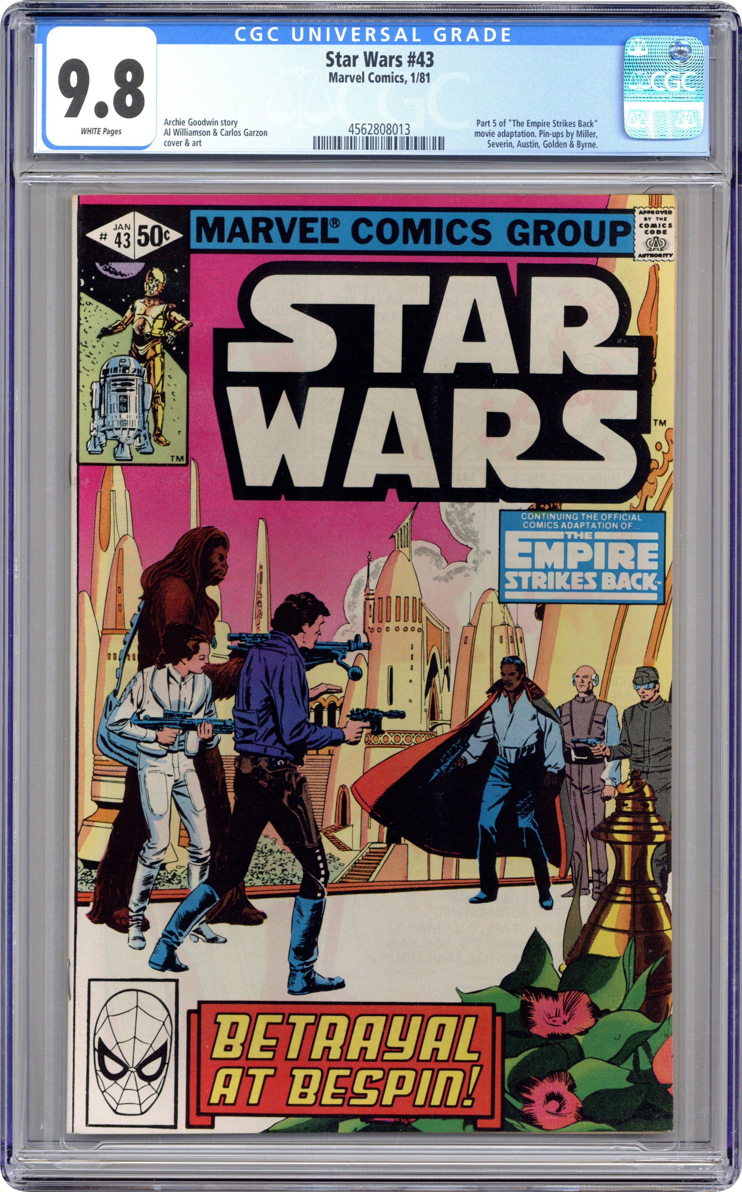 Ended Sep 22 2025 Bid History 7 bids Winning Bid $140 Direct Edition. The Empire Strikes Back: Part 5 of 6. "Betrayal at Bespin!" Based on the screenplay by George Lucas. Adapted by Archie Goodwin. Art by Al Williamson and Carlos Garzon. After their narrow escape from the pursuing Empire Fleet, the crew of the Millennium Falcon sets down on the Cloud City of Bespin for repairs. Lando Calrissian, proprietor of the floating facility, is an old friend of Han's. But he is an old friend with some dark secrets. Meanwhile, Luke's training under the tutelage of the Jedi Master, Yoda, is cut short when the young padawan senses that his friends are in great danger. Against Yoda's better judgement Luke races to Cloud City and the stage is set for the greatest battle between the forces of good and evil. Includes 5 pin-ups by Terry Austin, Michael Golden, John Byrne, Marie Severin, and Frank Miller. Cover price $0.50. Grade: CGC 9.8 explanation of grade Condition: Used (collectible)