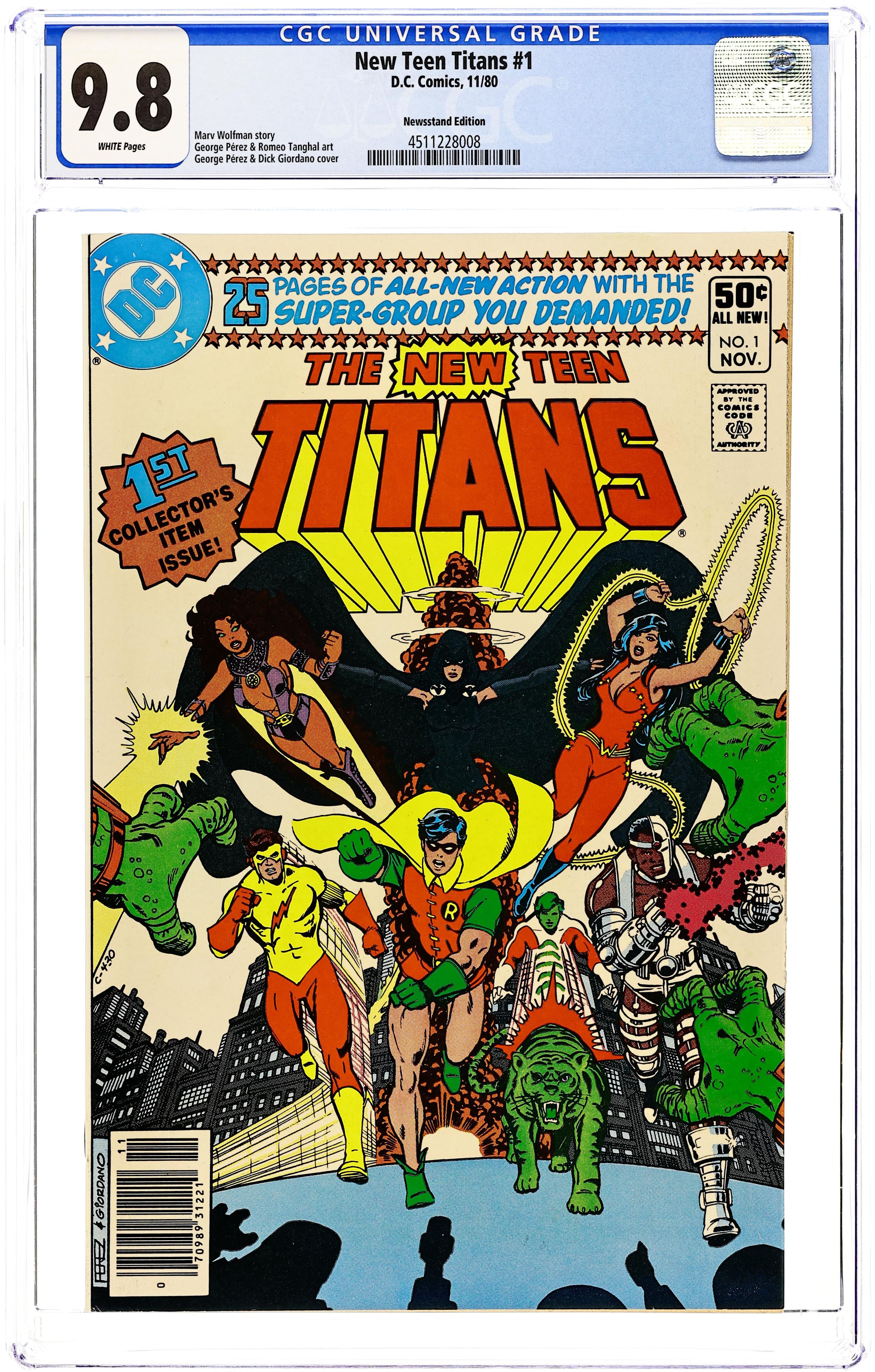 Newsstand Edition. The mysterious Raven tries to convince Robin, Wonder Girl, Kid Flash, Changeling, Cyborg & Starfire to form a new Teen Titans team in "The New Teen Titans." Cameos by Bruce Wayne and Grant Wilson. Script by Marv Wolfman, pencils by George Perez, finishes by Romeo Tanghal. Cover by Perez & Dick Giordano. Cover price $0.50. Grade: CGC 9.8 explanation of grade Condition: Used (collectible)