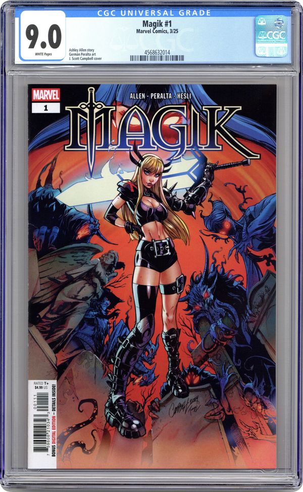 Ended Jun 13 2025 Winning Bid $33 Written by Ashley Allen. Art by German Peralta. Cover by J. Scott Campbell. THE MYSTIC MUTANT GOES DEMON HUNTING IN HER OWN NEW, ONGOING SERIES! The X-Man Ilyanna Rasputina strikes out on her own with new allies and dark powers arrayed against her. Something ancient has awakened beneath the Alaskan ice. Unfortunately for it, that's Magik's territory now! Written by rising star Ashley Allen (X-MEN: BLOOD HUNT - MAGIK, MARVEL ZOMBIES: BLACK, WHITE & BLOOD) and illustrated by the incomparable Germán Peralta (LOKI, BLACK PANTHER), this is a stylish, high-octane demon-hunting adventure starring the fiercest X-Man of them all! 32 pages, full color. Rated T+ Cover price $4.99. Grade: CGC 9.0 explanation of grade Condition: Used (collectible) unless item is a new release