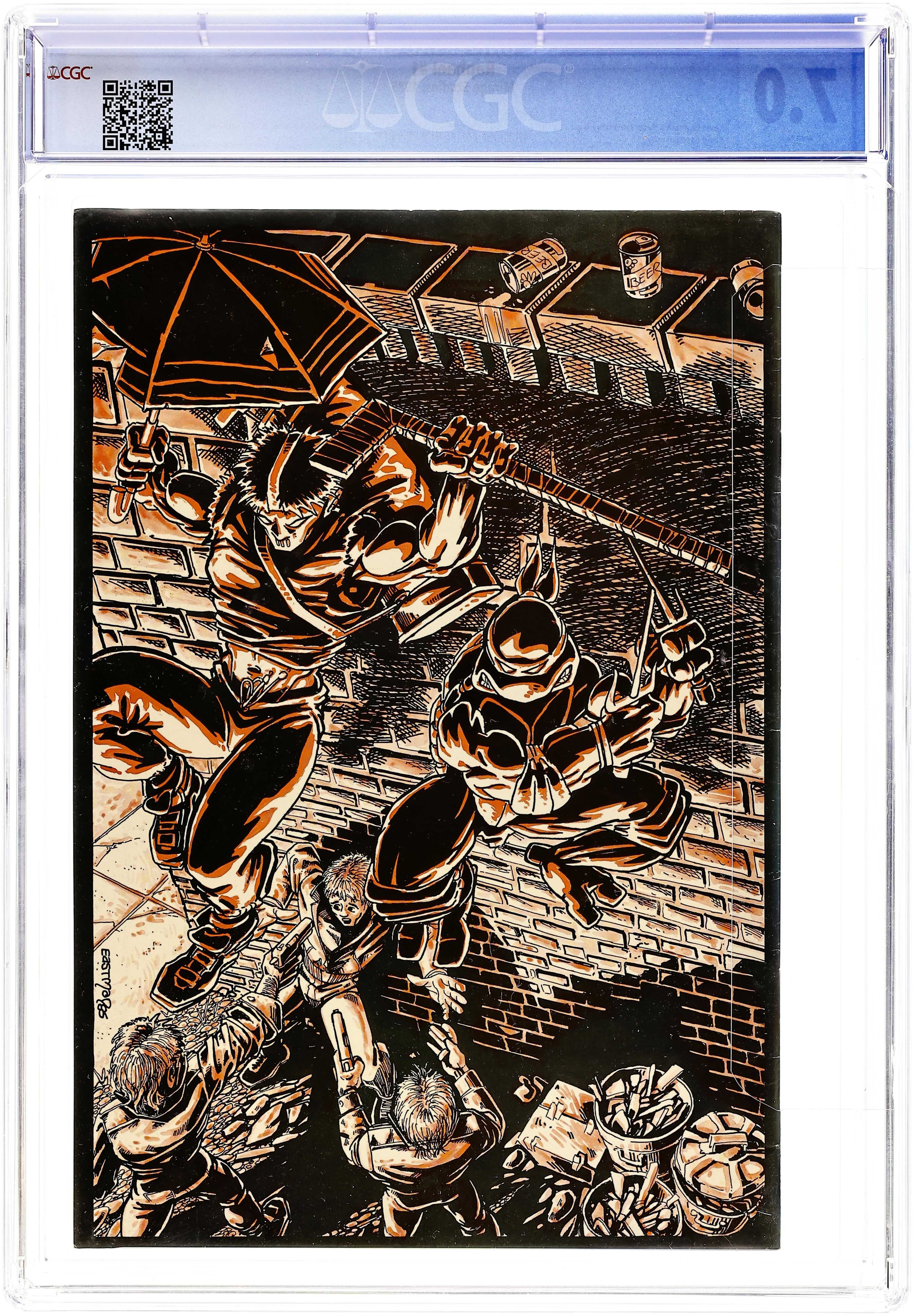 Ended Jun 11 2025 Winning Bid $160 1st printing (2 Color Cover) - 1st Teenage Mutant Ninja Turtles one-shot spin-off and contains first drawing of the Turtles as a group from 1983. 7 1/2-in. x 11-in. Cover price $1.50. Grade: CGC 7.0 explanation of grade Condition: Used (collectible)