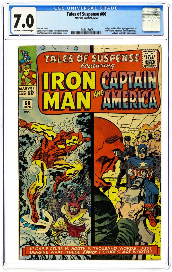 Cover pencils by Jack Kirby, inks by Frank Giacoia. Iron Man's costume changes slightly in "If I Fail, A World Is Lost!", script by Stan Lee, pencils by Don Heck, inks by Mike Esposito (as Mickey Demeo); US Senator Harrington Byrd has commissioned Stark Industries to build a new submarine, which is to be tested by Iron Man. "The Fantastic Origin of the Red Skull," script by Stan Lee, pencils by Jack Kirby, inks by Chic Stone; The Red Skull's origin is told and Cap is brainwashed into being a Nazi. 36 pages, full color. Cover price $0.12. Grade: CGC 7.0 explanation of grade Condition: Used (collectible)