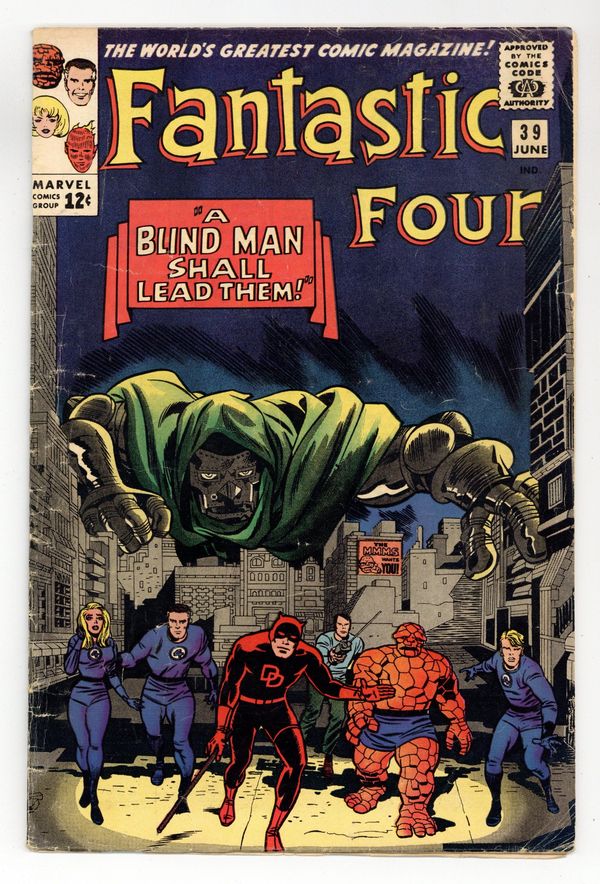 Cover pencils by Jack Kirby, inks by Chic Stone and Wally Wood (on Daredevil figure). A Blind Man Shall Lead Them!, script by Stan Lee, pencils by Jack Kirby, inks by Frank Giacoia [as Frank Ray] and Wally Wood (Matt Murdock and Daredevil figures); Reed devises mechanical devices to enable the FF to duplicate their vanished super-powers; Matt Murdoch visits the FF and Dr. Doom attacks; Daredevil assists the FF in battling Doom. Cameos by Medusa, the Wizard, the Sandman, and the Trapster. 36 pgs. $0.12. Cover price $0.12. Grade: GD+ 2.5 explanation of grade Condition: Used (collectible)