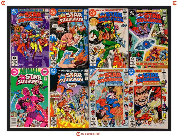Issues 10, 11, 12D, 13D, 14-16 of All Star Squadron (1981); and All Star Squadron (1982) Annual 1. Most will grade in the FN/VF to VF+ range.