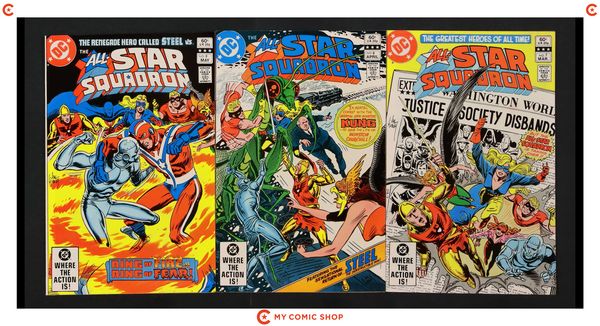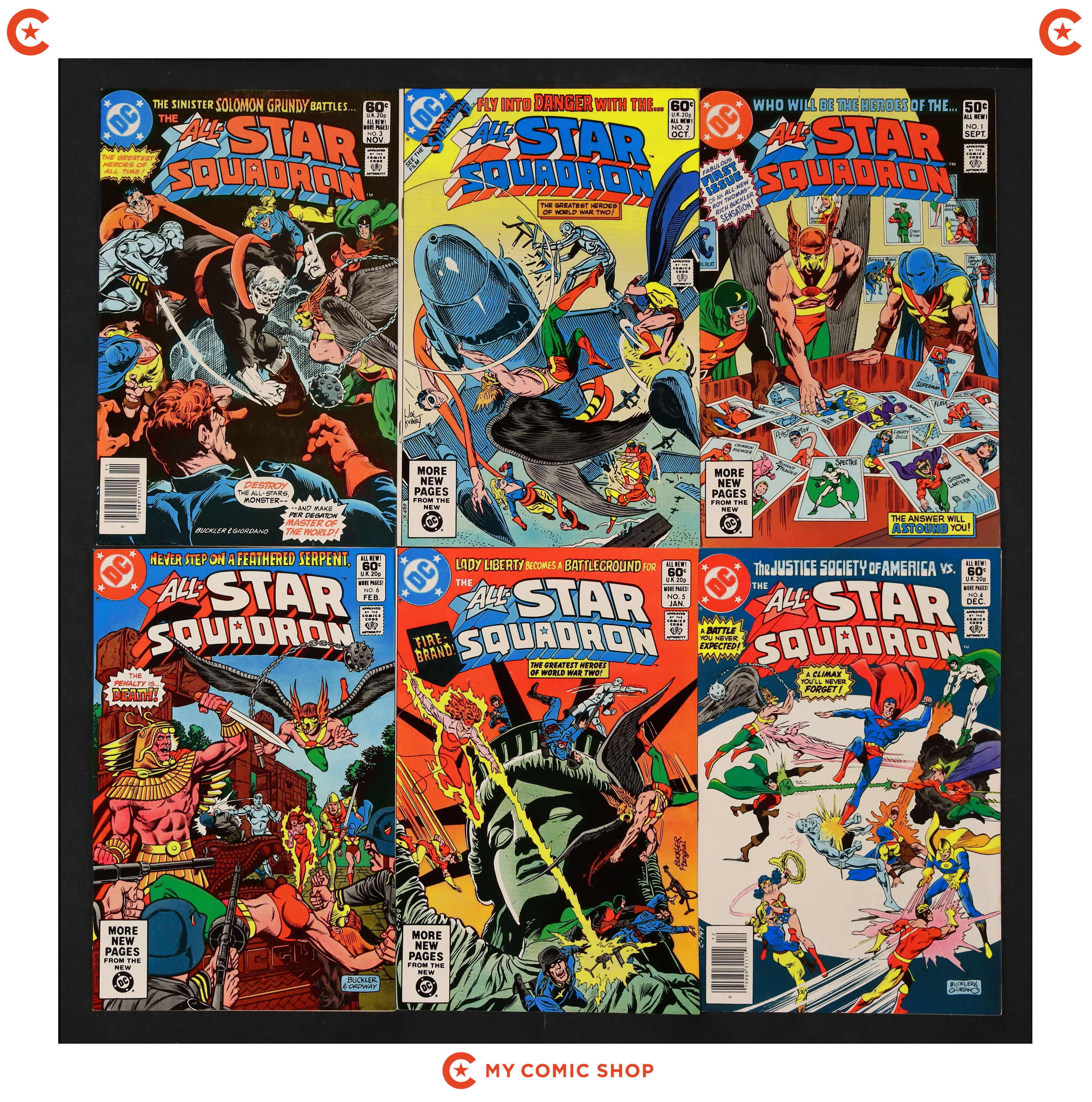Issues 1D, 2-4, 5D, 6, 7, 8D, 9D of All Star Squadron (1981). Most will grade in the VF- to VF+ range, with 9 grading at FN+.
