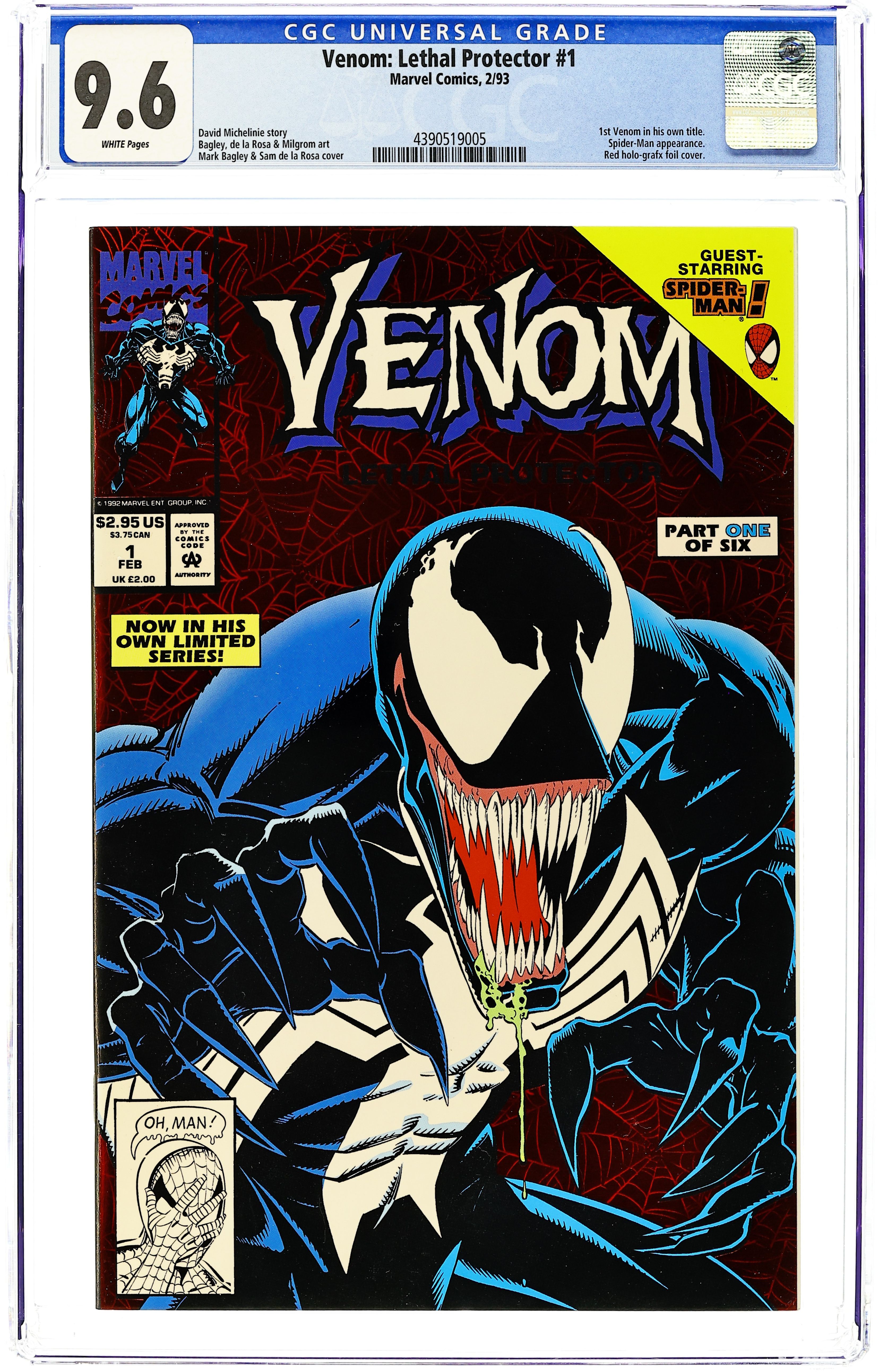 Direct Edition. Red Foil Enhanced CardStock cover, art by Mark Bagley and Sam de la Rosa. Lethal Protector Part 1: Dark Soul Drifting, script by David Michelinie, pencils by Mark Bagley, inks by Al Milgrom and Sam de la Rosa; Venom moves to San Fransisco to try out his new protection of innocents racket; Venom and Spidey save a group of homeless folk. 36 pgs., full color. $2.95. Cover price $2.95. Grade: CGC 9.6 explanation of grade Condition: Used (collectible)
