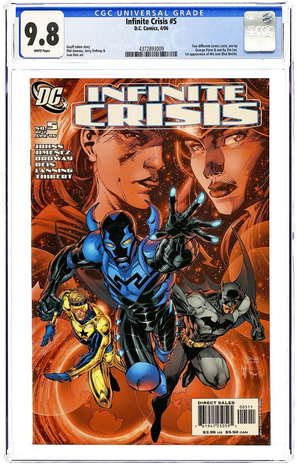 Ended Jun 3 2025 Winning Bid $55 Jim Lee Cover - Written by Geoff Johns Art by Phil Jimenez & Andy Lanning. Covers by Jim Lee & Sandra Hope and George Pérez. 1st costumed appearance of the third Blue Beetle. (for 1st appearance as Jaime Reyes, see Infinite Crisis #3). The DCU shakes apart as Superman of Earth 2 finally confronts our Superman. Meanwhile, heroes are disappearing throughout the DC Universe, a transformed villain returns, and the mystics of every world and dimension seek help from the very Spirit that is destroying them. Retailers please note: This issue will ship with covers by Lee & Hope (approximately 50%) and Pérez (approximately 50%). On sale February 15 ? 5 of 7 ? 40 pg, FC, $3.99 US Cover price $3.99. Grade: CGC 9.8 explanation of grade Condition: Used (collectible)