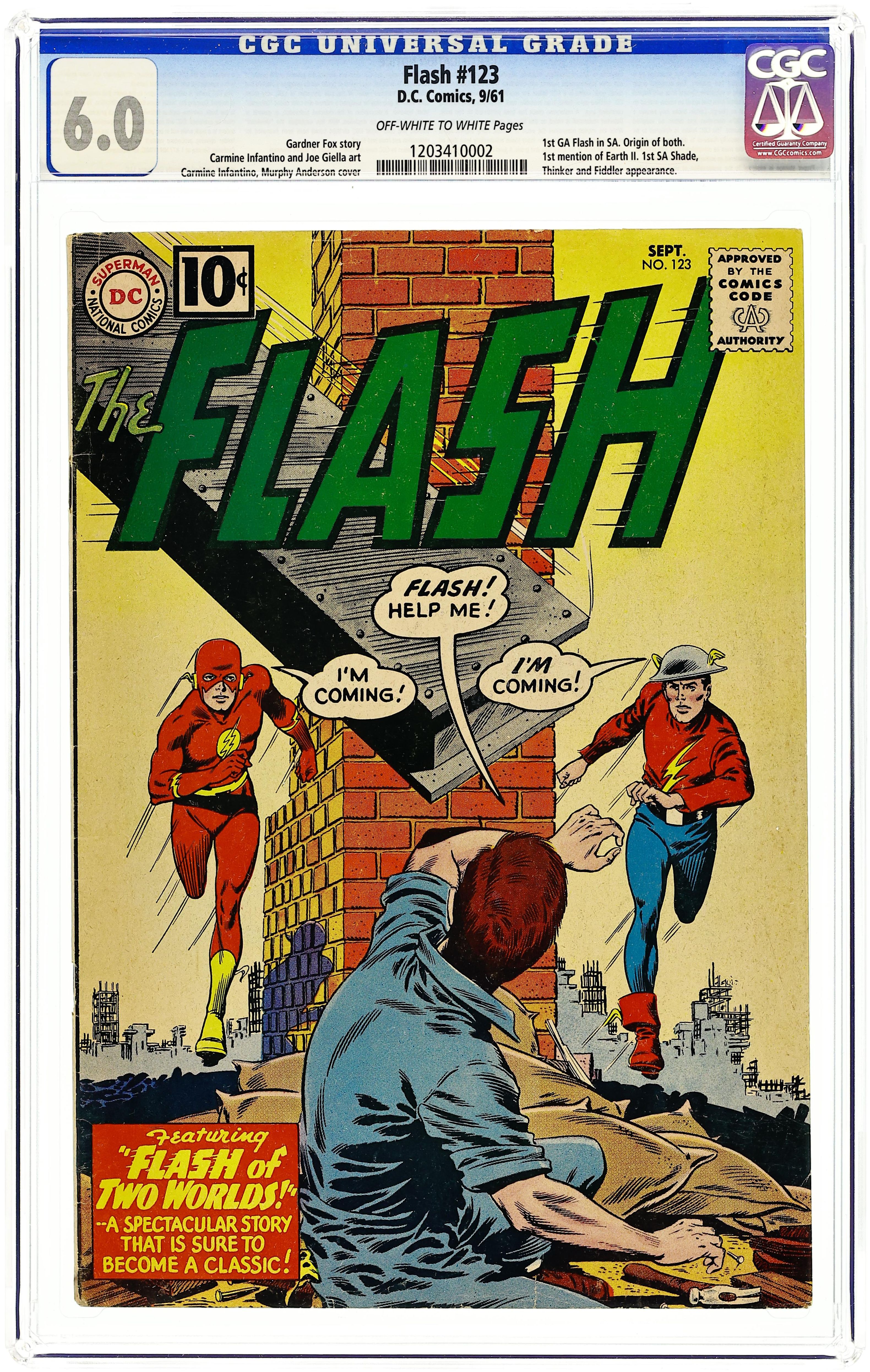 Ended Jul 15 2025 Winning Bid $1,225 Cover pencils by Carmine Infantino, inks by Murphy Anderson. 1st Silver Age appearance of Golden Age Flash; 1st mention of an Earth-2 where Golden Age heroes live. Flash of Two Worlds!, script by Gardner F. Fox, pencils by Carmine Infantino, inks by Joe Giella; Barry Allen appears at the Community Center in Central City to perform for kids, and during one of his amazing tricks, is mysteriously transported to Keystone City, a place that he recalls that the original Flash once lived; The two meet and Barry surmises that Jay lives on a parallel Earth, one that evidently Earth-1 writer Gardner Fox tuned in on when he wrote the adventures of the Flash in the 1940's; Jay tells Barry that a crime wave has hit Keystone City and asks Barry for his help. Fastest Trips Around The World! fact page. Promo for Superman Annual #3 and Secret Origins #1. Promo for Batman Annual #1, pencils by Curt Swan, Sheldon Moldoff, and Dick Sprang, inks by Charles Paris. Palisades Amusement Park ad with Superman. 36 Pages, Full Color. Cover price $0.10. Grade: CGC 6.0 explanation of grade Condition: Used (collectible)