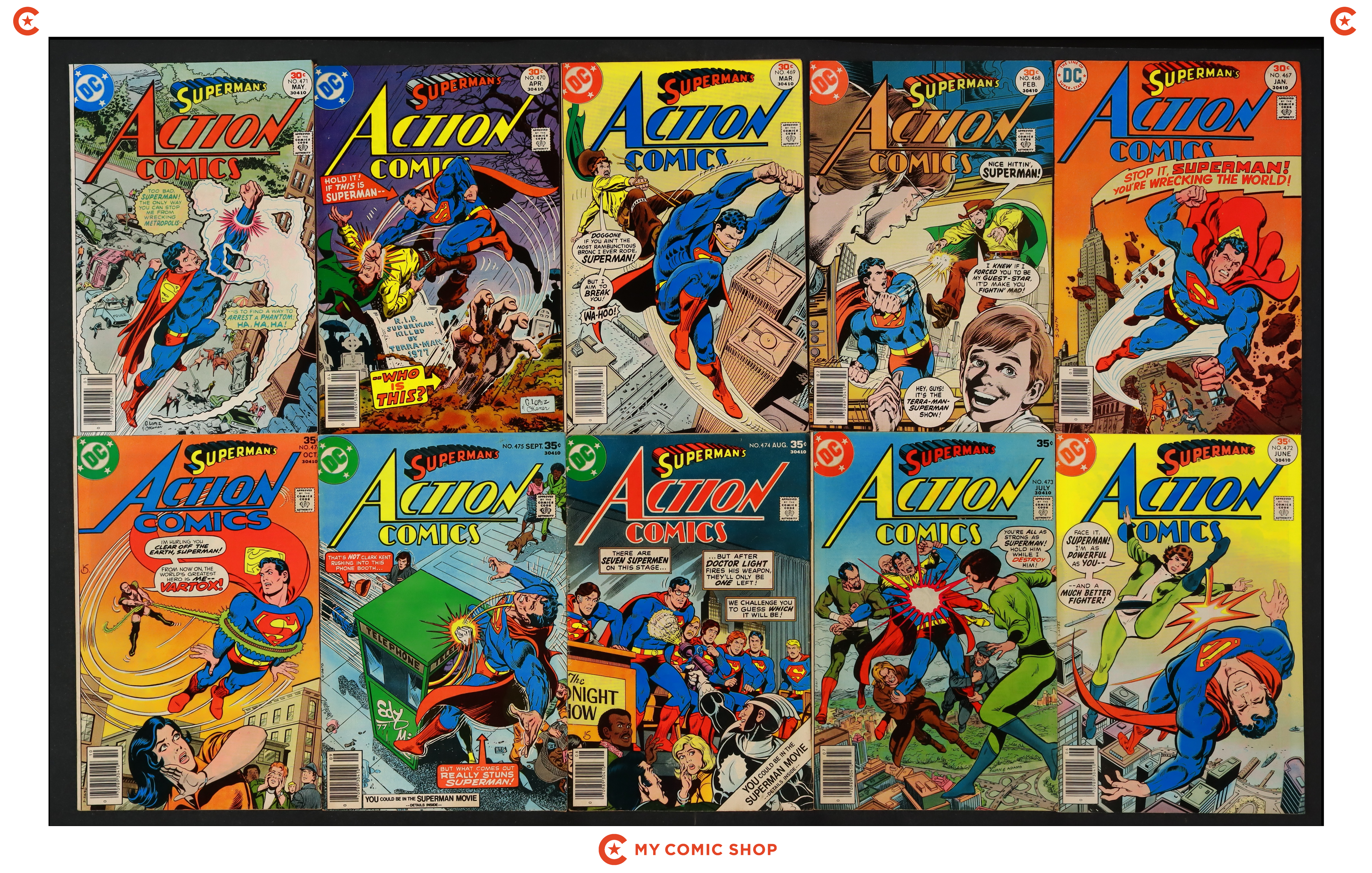 Issues 467-476 of Action Comics (1938 DC). Most will grade in the VG-FN range.