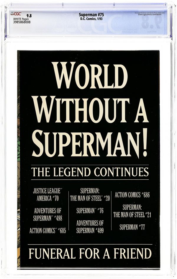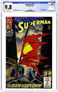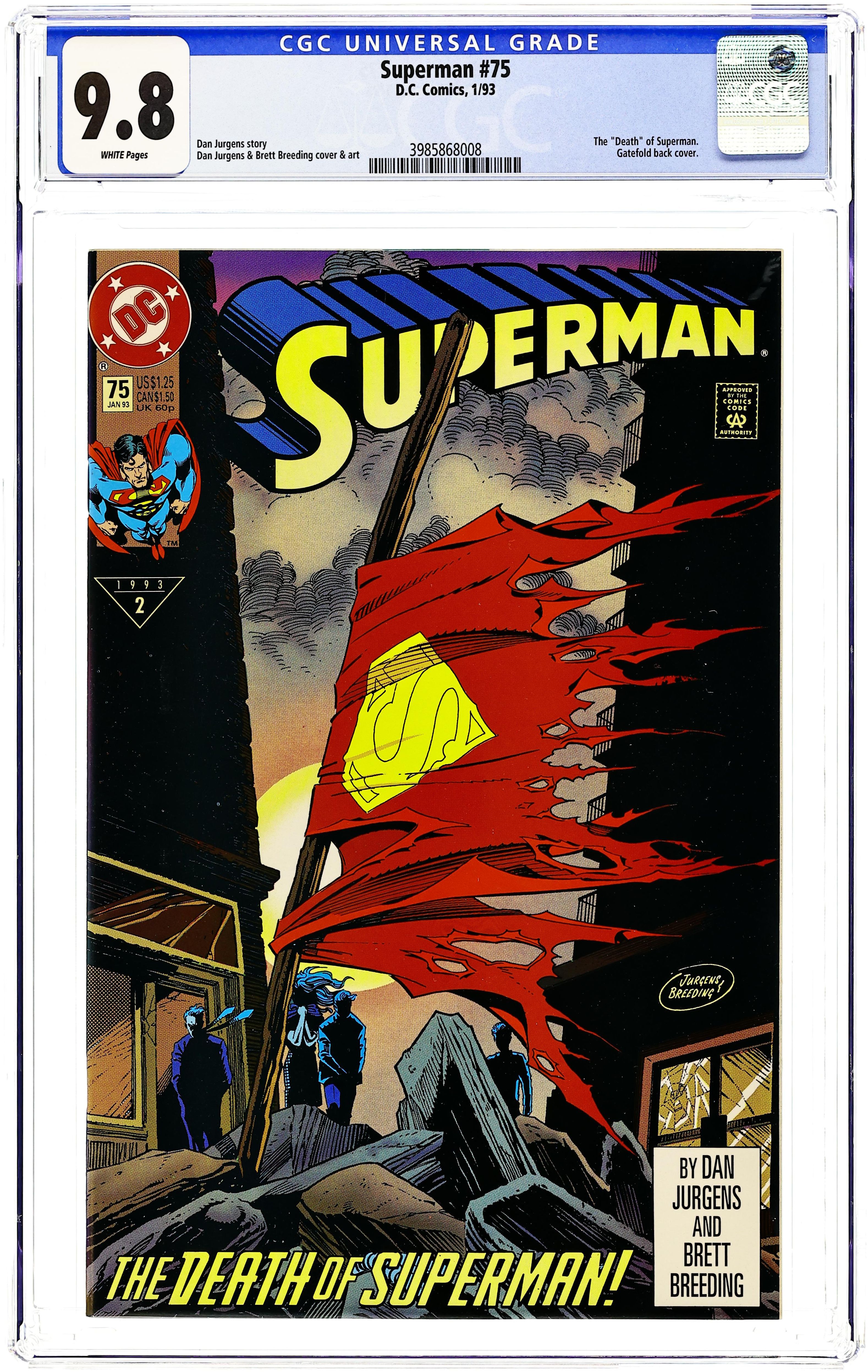 1st printing. Doomsday! Part 7 of 7. "Doomsday!" Story by Dan Jurgens. Art by Dan Jurgens and Brett Breeding. Here it is, the issue that rocked the DC Universe. An unstoppable force named Doomsday crash landed on Earth and has cut a swath of death and destruction across the country, all the way to Metropolis. Even the Justice League, the world's premiere super-team, was powerless before this creature's might. Now one man stands defiantly in Doomsday's way and vows that the creature's insanity stops here. Superman fights his strongest opponent to the death in the streets of Metropolis. Cover price $1.25. Grade: CGC 9.8 explanation of grade Condition: Used (collectible)