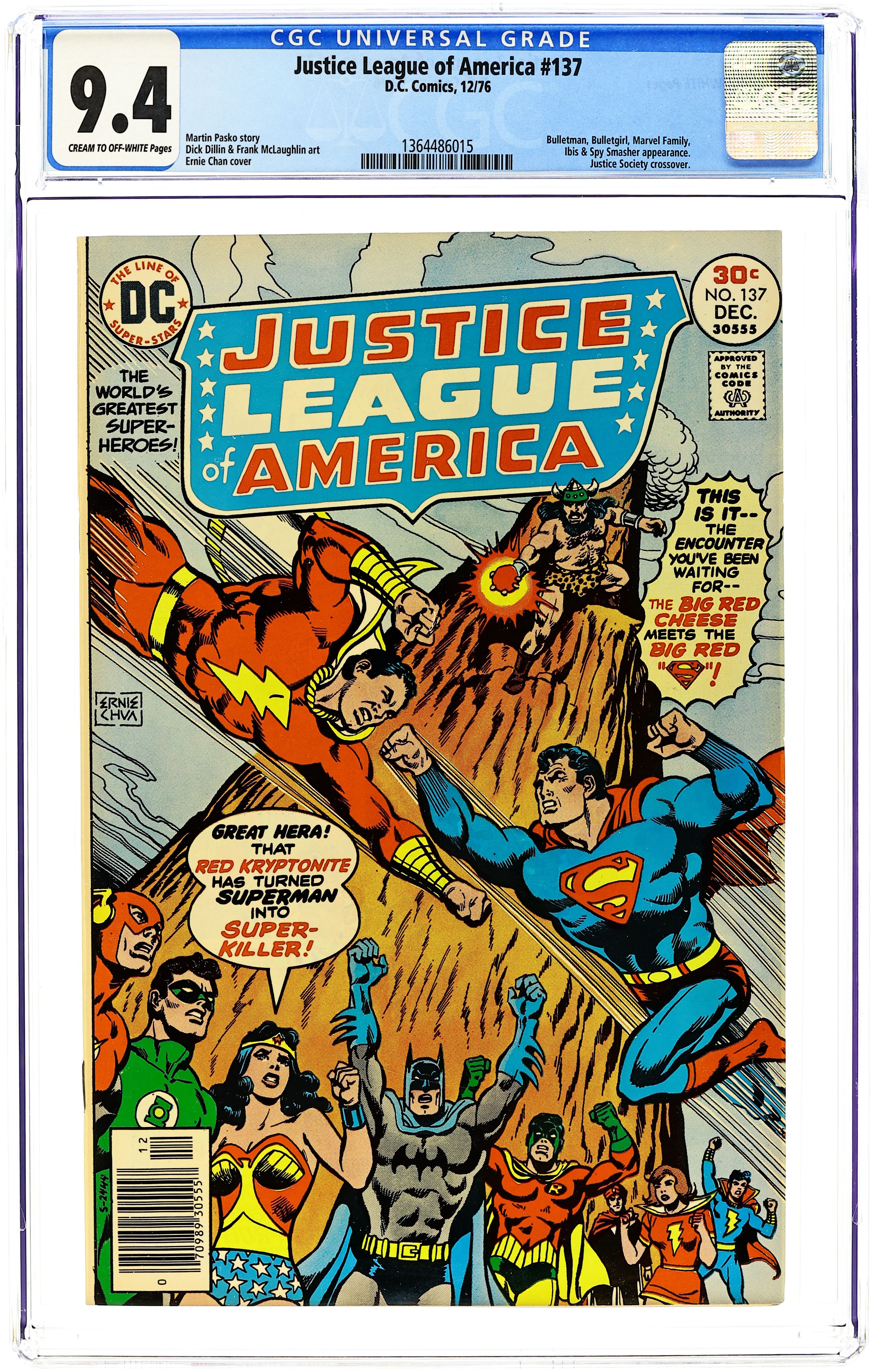 Ended Jul 16 2025 Winning Bid $38 Cover pencils by Ernie Chan, inks by Frank McLaughlin. Crisis in Tomorrow!, script by E. Nelson Bridwell (plot) and Martin Pasko (script), pencils by Dick Dillin, inks by Frank McLaughlin; As the final part of King Kull's plan continues, it is yet thwarted again by the three groups of heroes, the JLA, JSA and Squadron of Justice; When Superman confronts Kull on the Rock of Eternity, however, he's turned into a killer by a dose of Red Kryptonite, and almost destroys Captain Marvel, but when Marvel utters 'Shazam!', the spell is broken and is saved by Superman while in freefall as Billy. Kull is then captured by the Marvel Family (who also free the trapped Pantheon of Gods and Goddesses), and the four triumphant heroic groups then leave back to their respective worlds from the Rock. 32 pgs. $0.30. Cover price $0.30. Grade: CGC 9.4 explanation of grade Condition: Used (collectible)