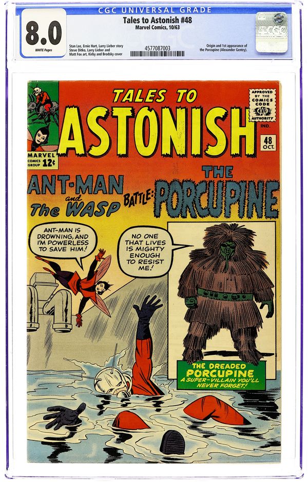Ended Jul 16 2025 Winning Bid $216 Cover by Jack Kirby and Sol Brodsky. Ant-Man and the Wasp Defy the Porcupine!, script by Stan Lee and Ernie Hart [as H. E. Huntley], art by Don Heck; The Porcupine decides to rob a burglar-proof bank designed by Henry Pym. The Inventor text story. Grayson's Gorilla!, script by Stan Lee and Larry Lieber, art by Larry Lieber and Matt Fox; A scientist tries to give himself the strength of a gorilla for his own ends. The Little Green Man!, script by Stan Lee, art by Steve Ditko; An unscrupulous pilot tricks an alien into refitting his plane, but throws the creature out instead of rewarding it. 36 pgs., full color. $0.12. Cover price $0.12. Grade: CGC 8.0 explanation of grade Condition: Used (collectible)