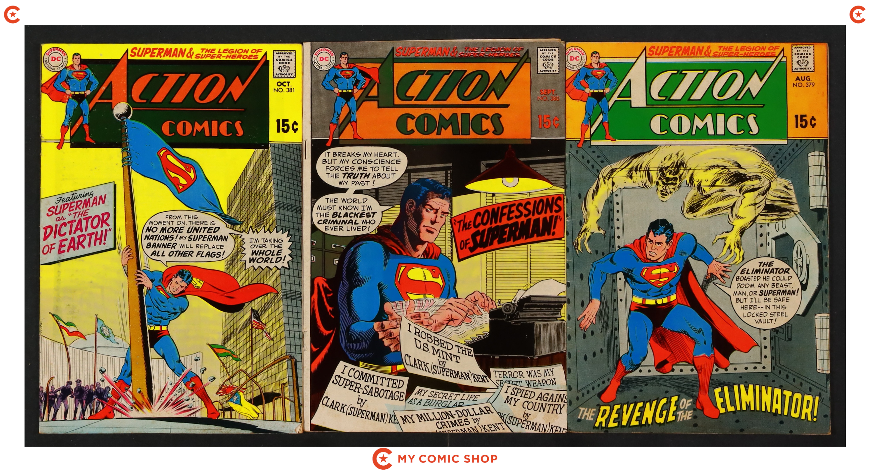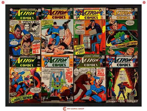 Issues 370-372 and 374-381 of Action Comics (1938 DC). Most will grade in the VG to GD range.